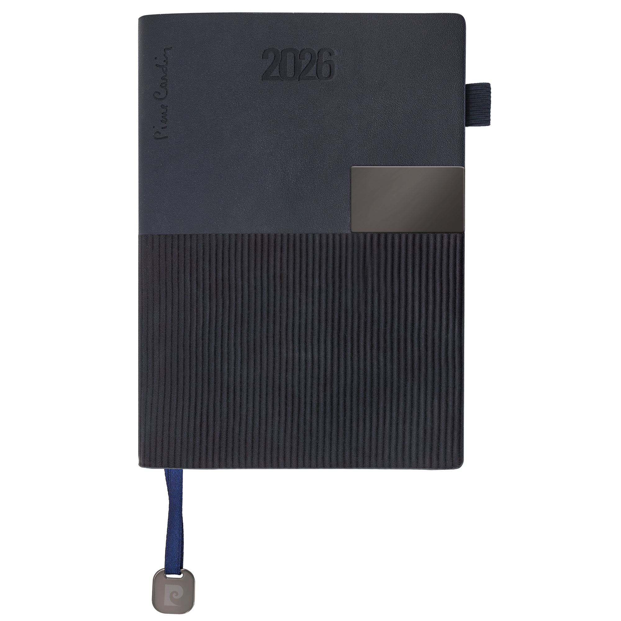 Cubierta flexible con dos elegantes texturas combinadas. Incluye placa metálica para marcaje personalizado, goma porta bolígrafos (bolígrafo no incluido) y marcados con detalle metálico grabado.