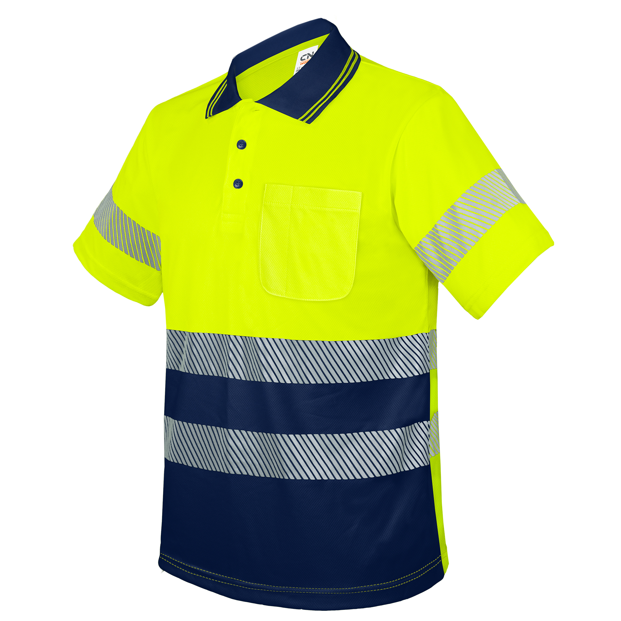 Polo manga corta con bandas reflectantes realizadas 100% en poliéster, con una gran variedad de colores.