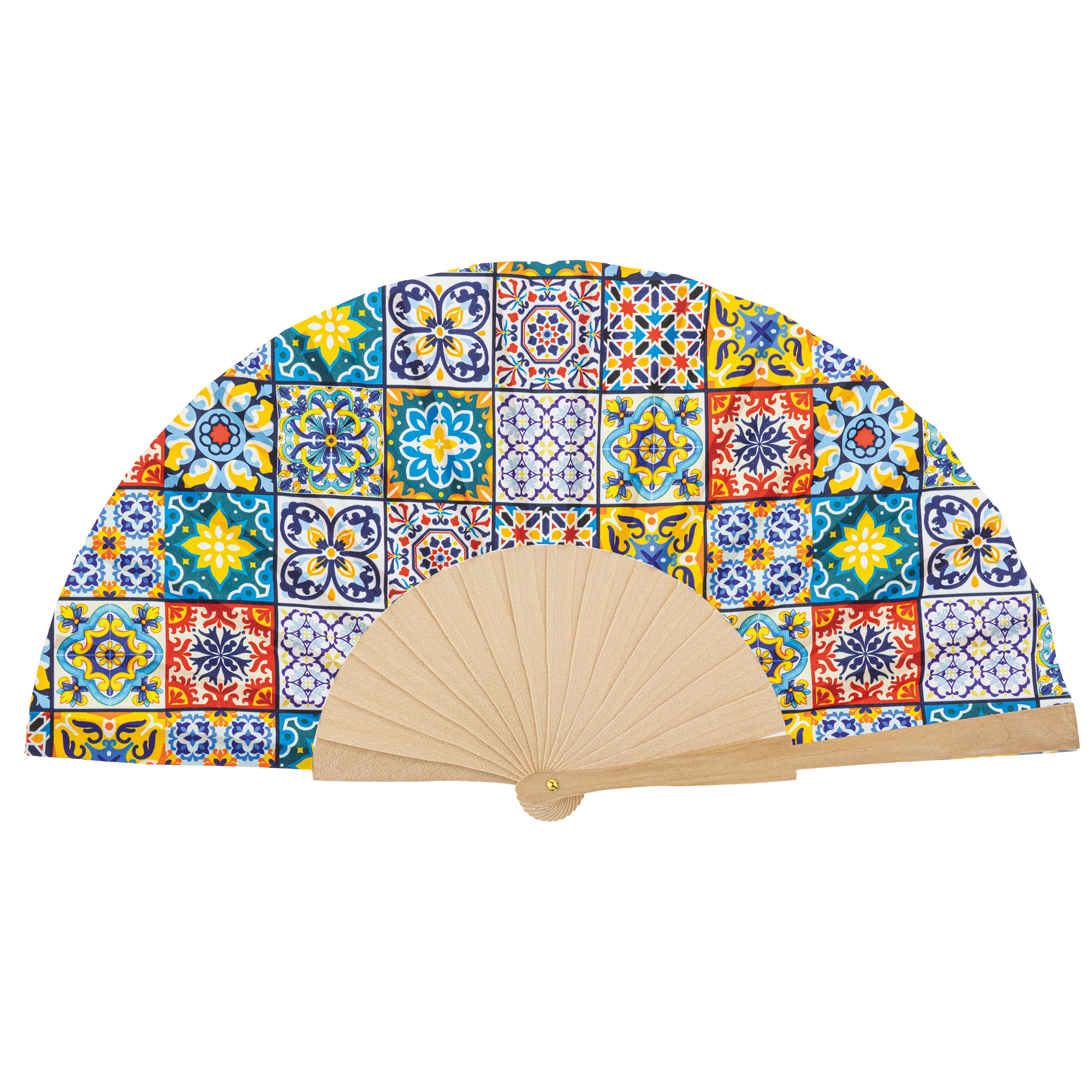 Cada abanico presentado en una caja de cartón de color plateado.