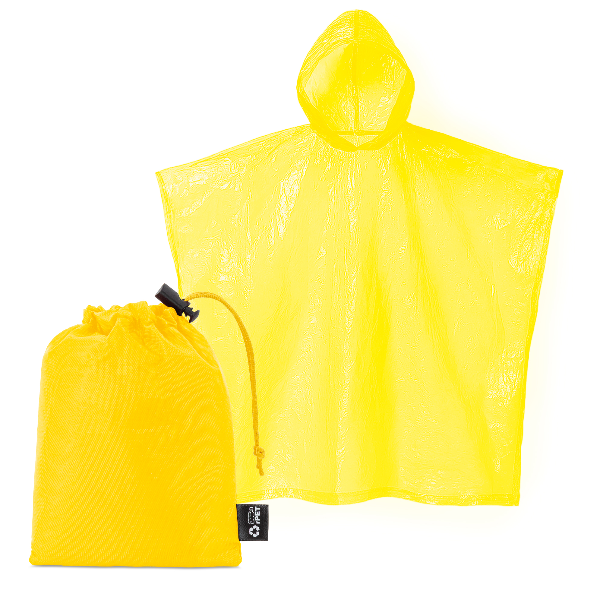 Chubasquero ligero y plegable, ideal para imprevistos bajo la lluvia. Se presenta en una práctica bolsa de rPet con cierre de cordón, facilitando su transportes y almacenamiento. (medida bolsa 12x15 cm)