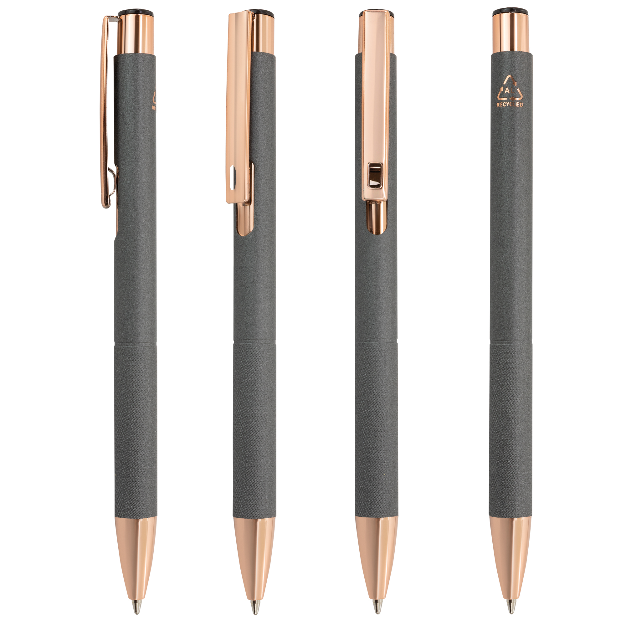 Bolígrafo fabricado en aluminio reciclado, con acabado mate y detalles en tono oro rosé. Su cuerpo elegante y minimalista es ideal como regalo corporativo. Incorpora una zona texturizada en la empuñadura que mejora el agarre.