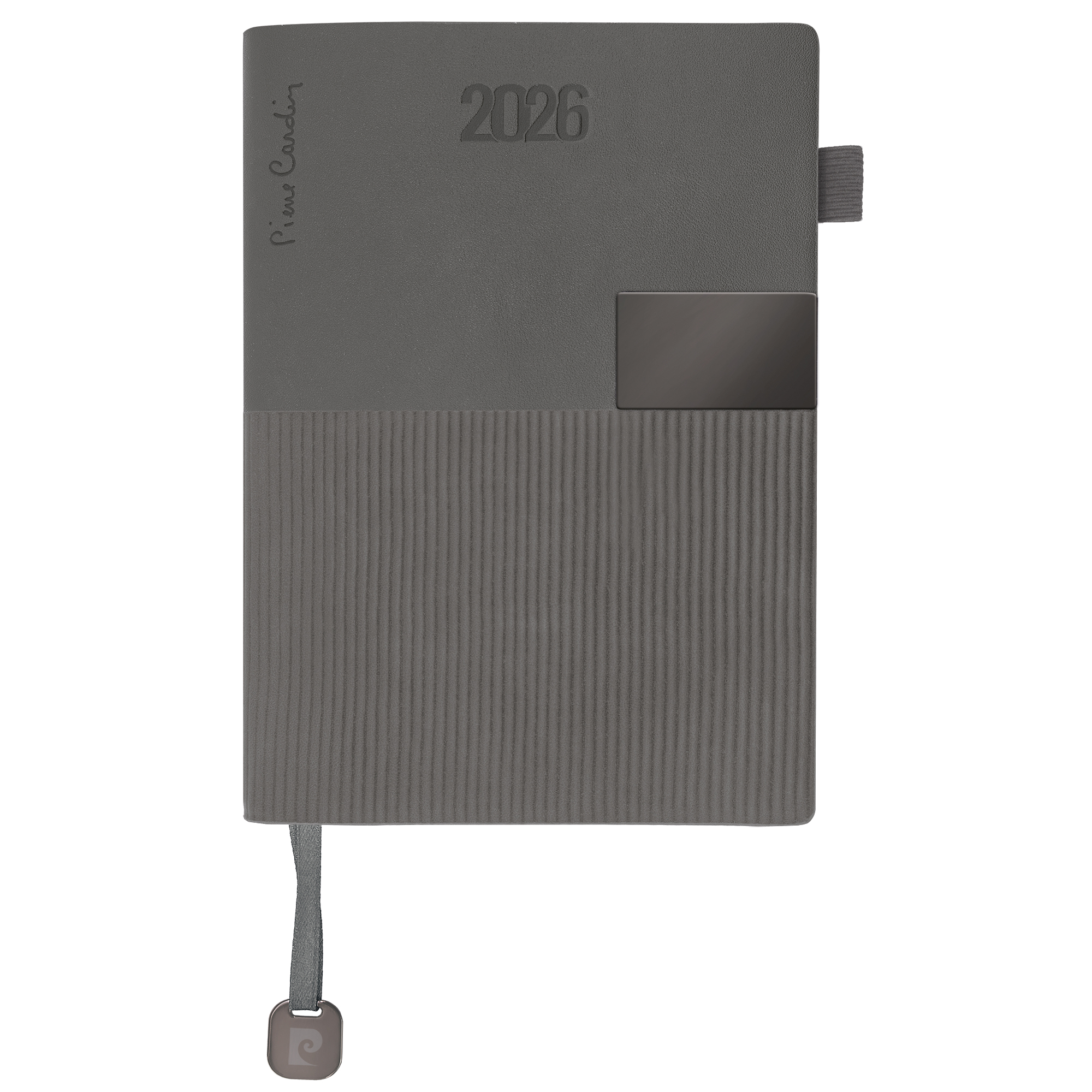 Cubierta flexible con dos elegantes texturas combinadas. Incluye placa metálica para marcaje personalizado, goma porta bolígrafos (bolígrafo no incluido) y marcados con detalle metálico grabado.
