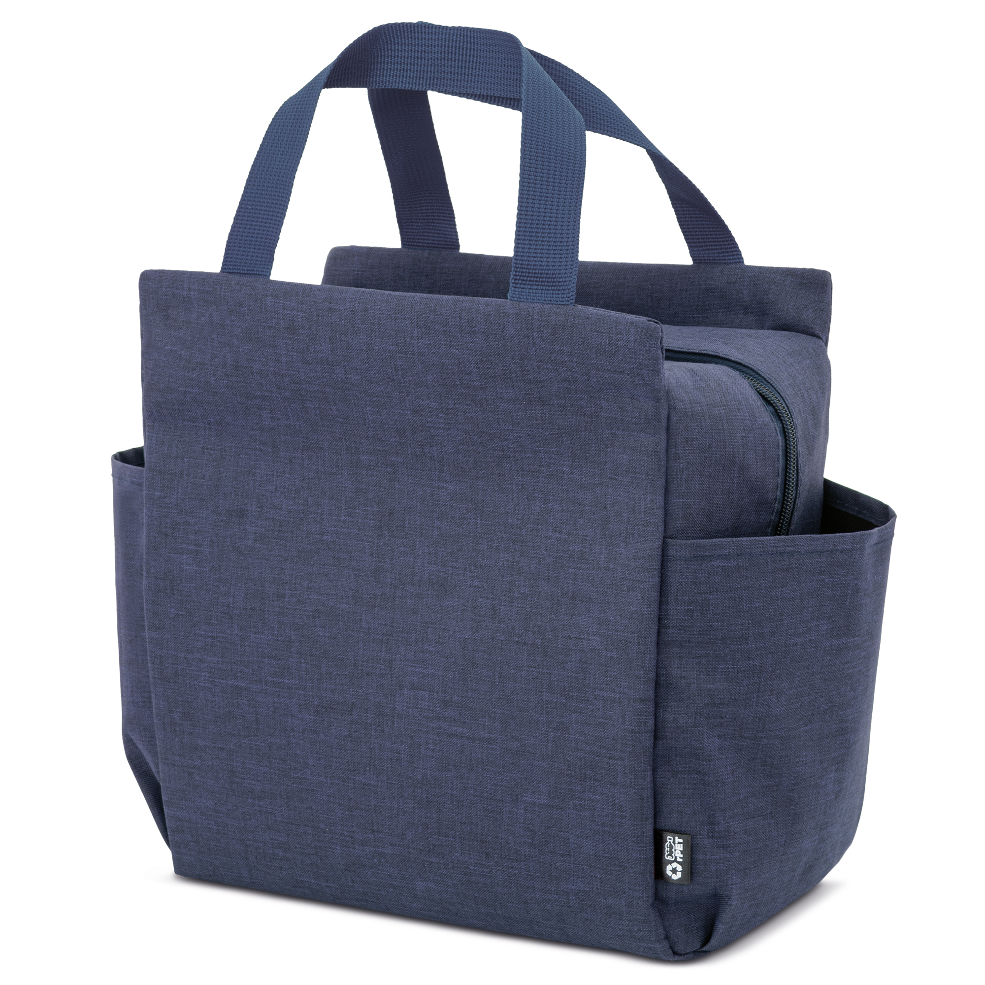 Bolsa nevera de gran capacidad, fabricada en poliéster rPet de acabados jaspeados con bolsillos en los laterales perfectos para una botella (medida 13x16.5 cm cada uno).