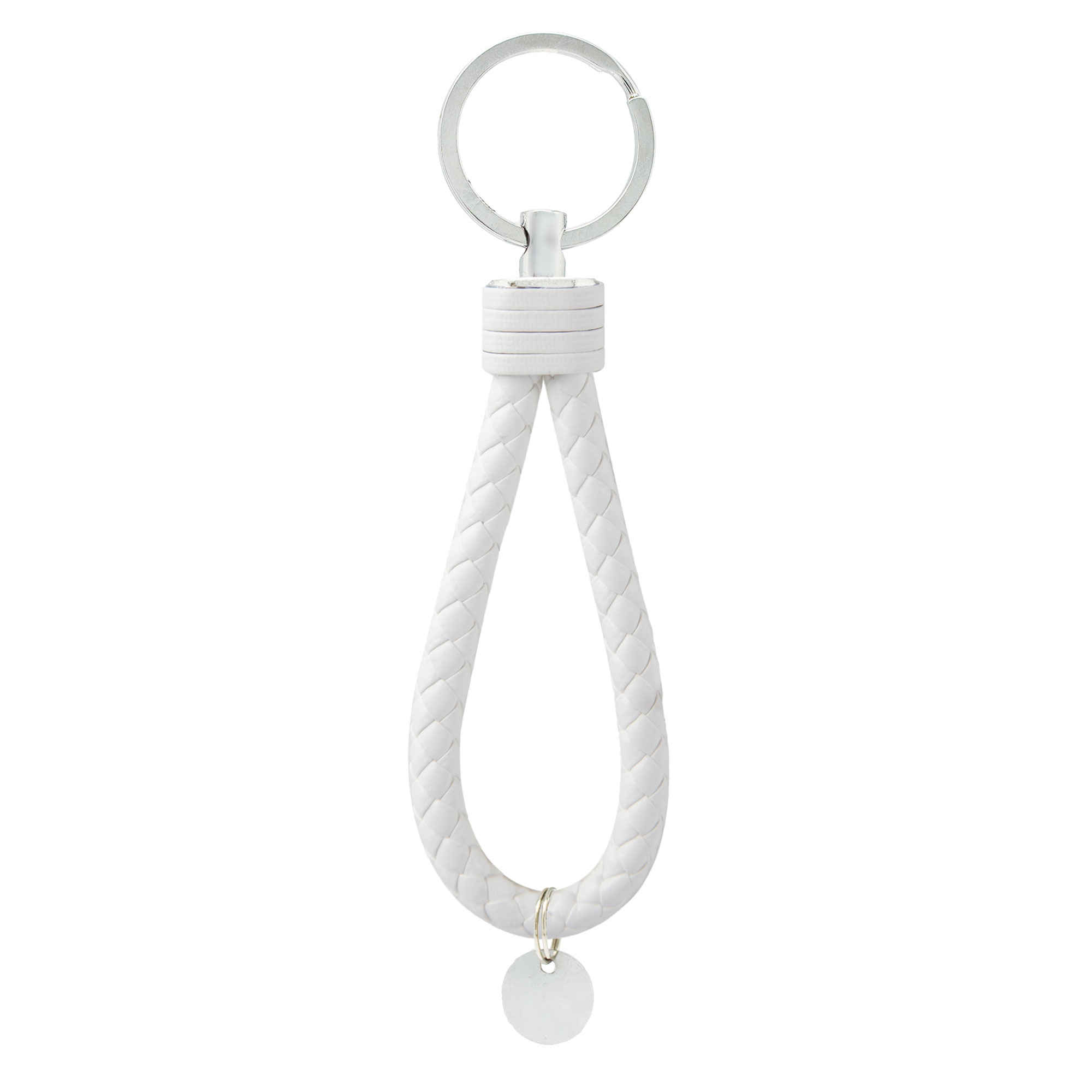 Elegante llavero realizado en polipiel trenzada, con detalle de chapita metálica redondeada.