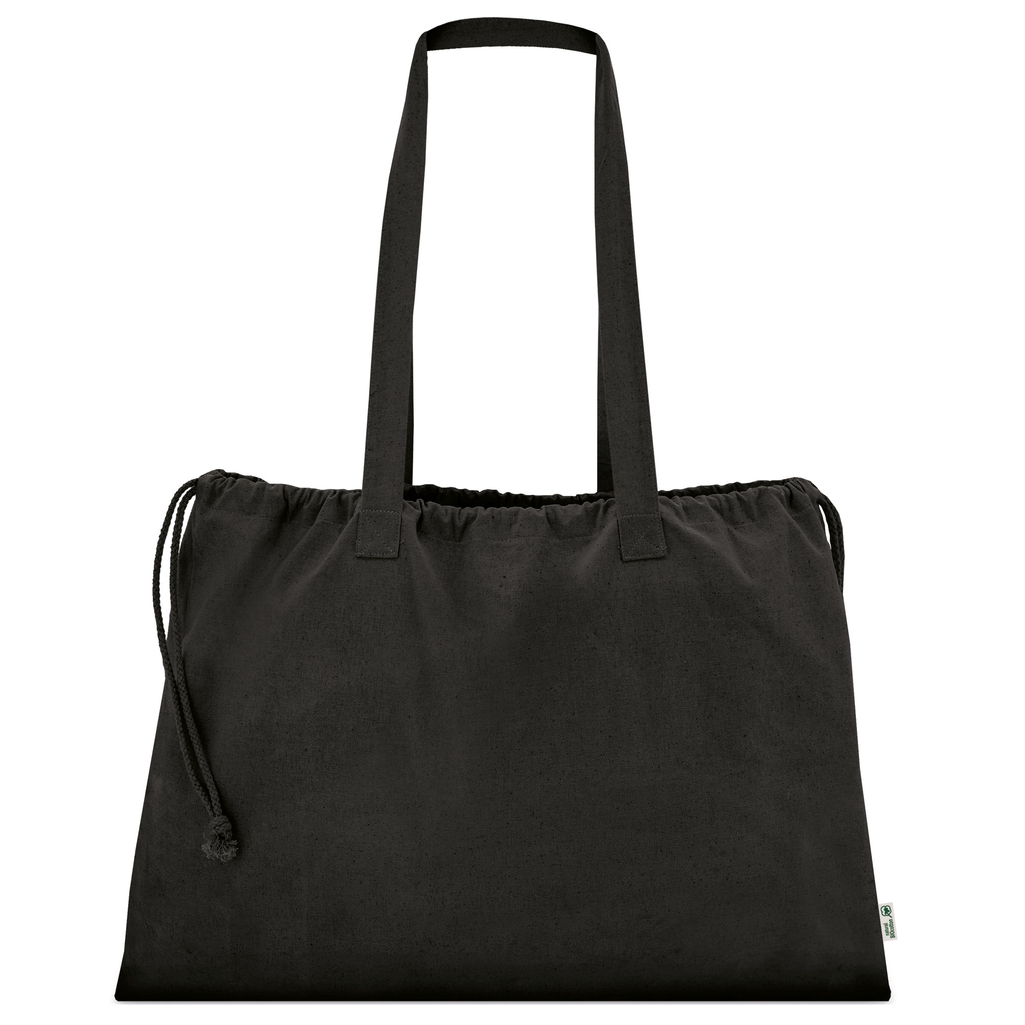 Bolsa de gran capacidad y asas largas disponible en color crudo y negro (10030-NE), realizada en algodón orgánico, incluye un cordón para ajustar cierre (medida asas 40x2,5 cm)
