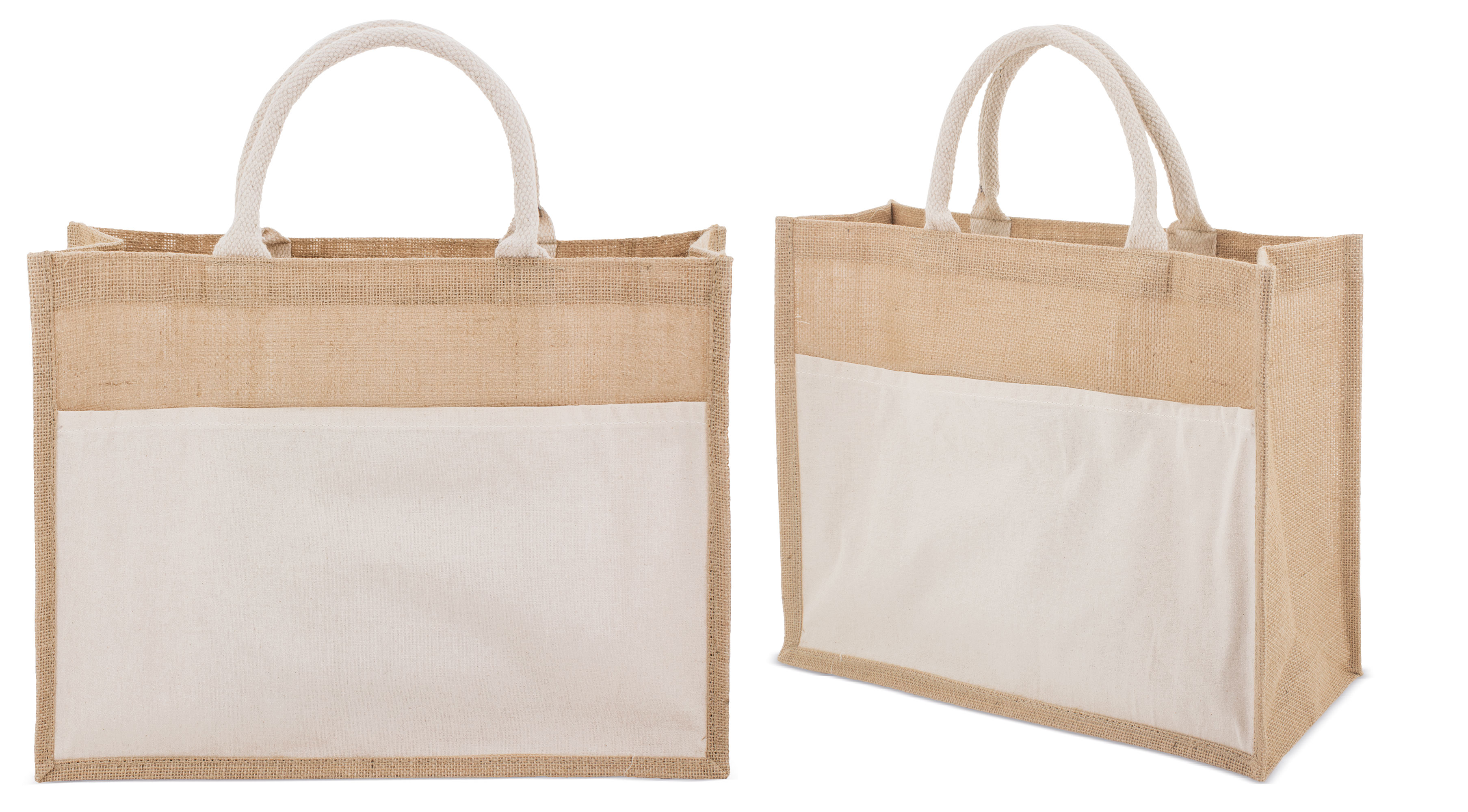 Fabricada con algodón y yute laminado ultra resistente. Incluye un bolsillo exterior y asas extraconfort.