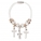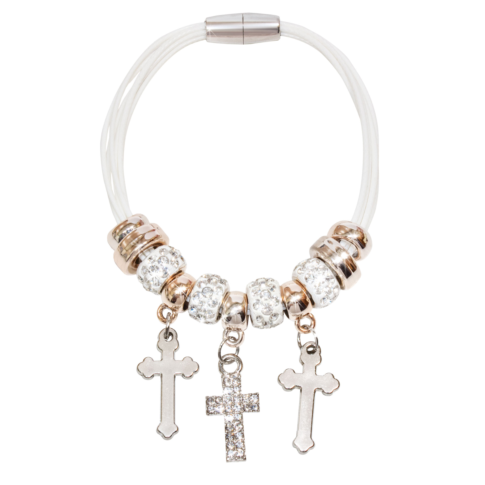 Elegante pulsera con cierre imantado, abalorios brillantes y colgantes de cruces.