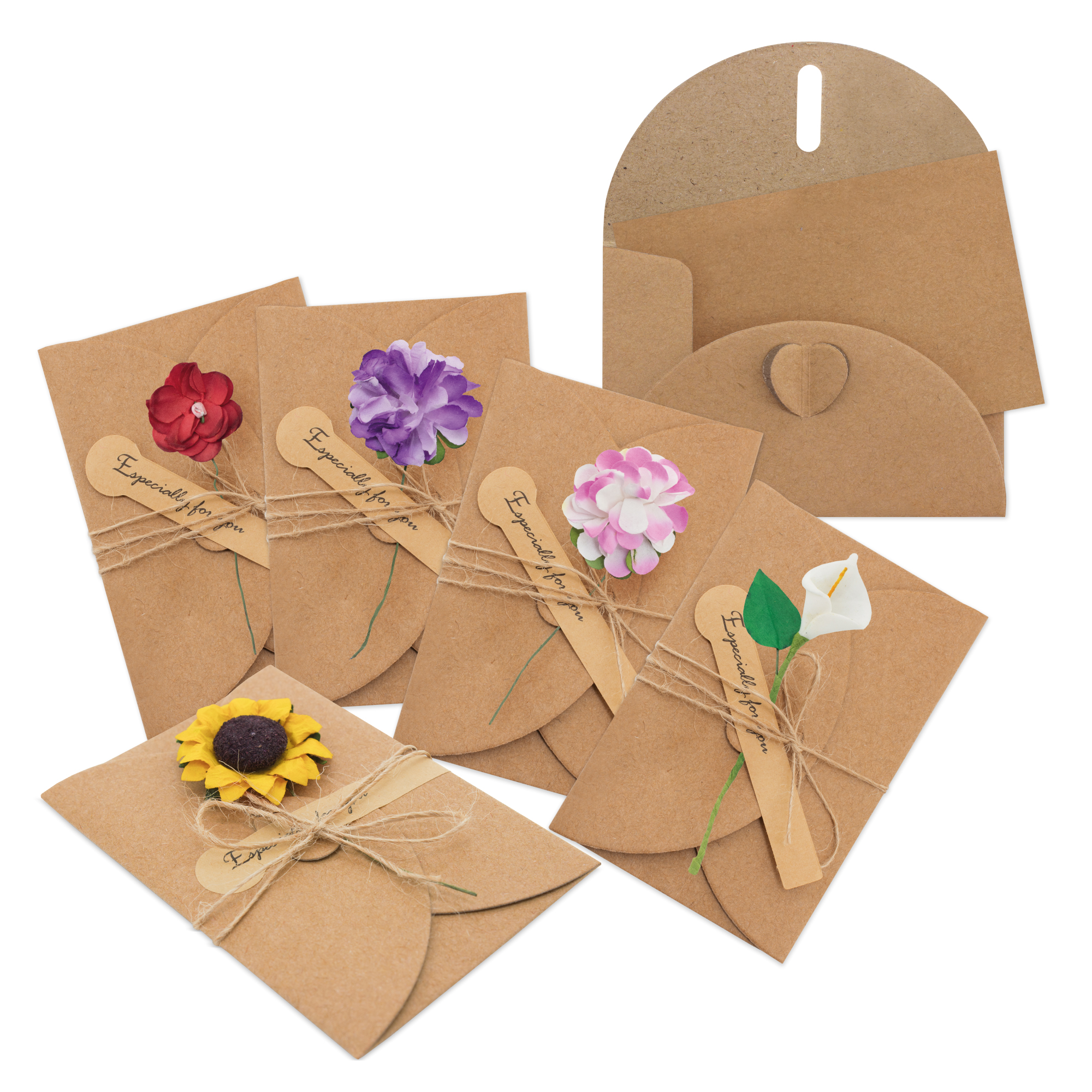 Incluye un sobre, una tarjeta, una pegatina, una cuerda y una flor.