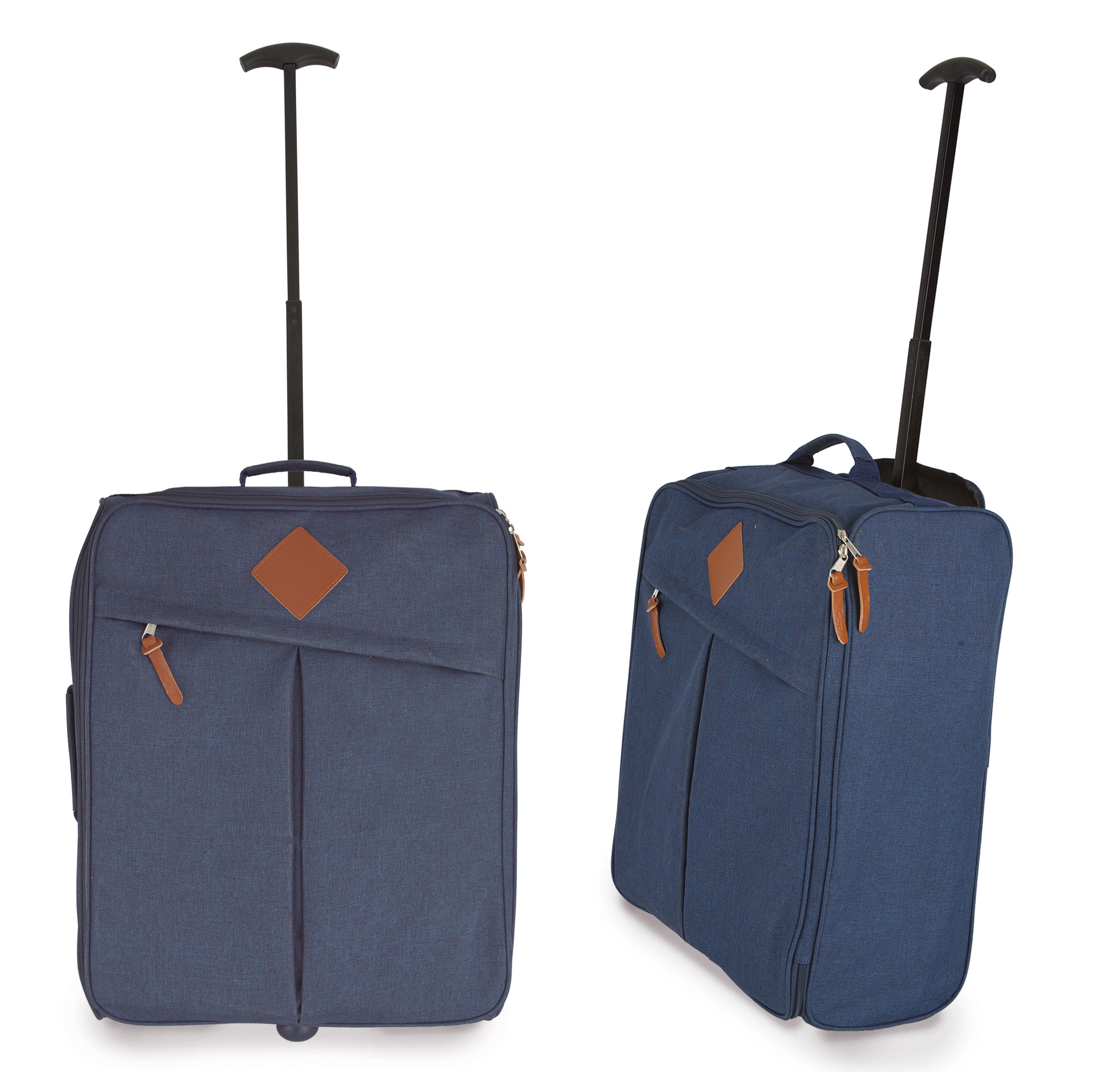 Moderno trolley de la firma Pierre Delone, con tejido jaspeado y apliques de polipiel color camel. Tiene dos ruedas y varios topes protectores en sus bases de apoyo.