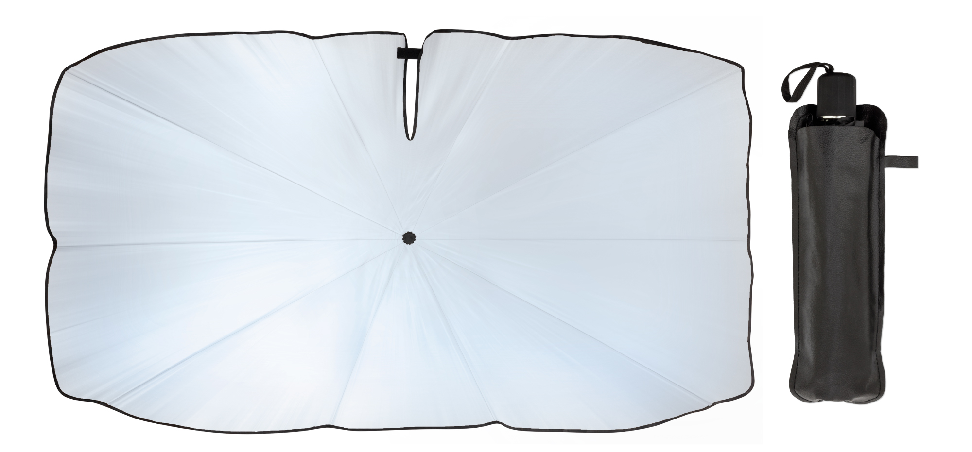Sombrilla parasol para parabrisas, diseño plegable y compacto. No ocupa espacio en el coche, incluye una bolsa protectora en la que se puede guardar fácilmente (medida bolsa 11,5x32,5cm)