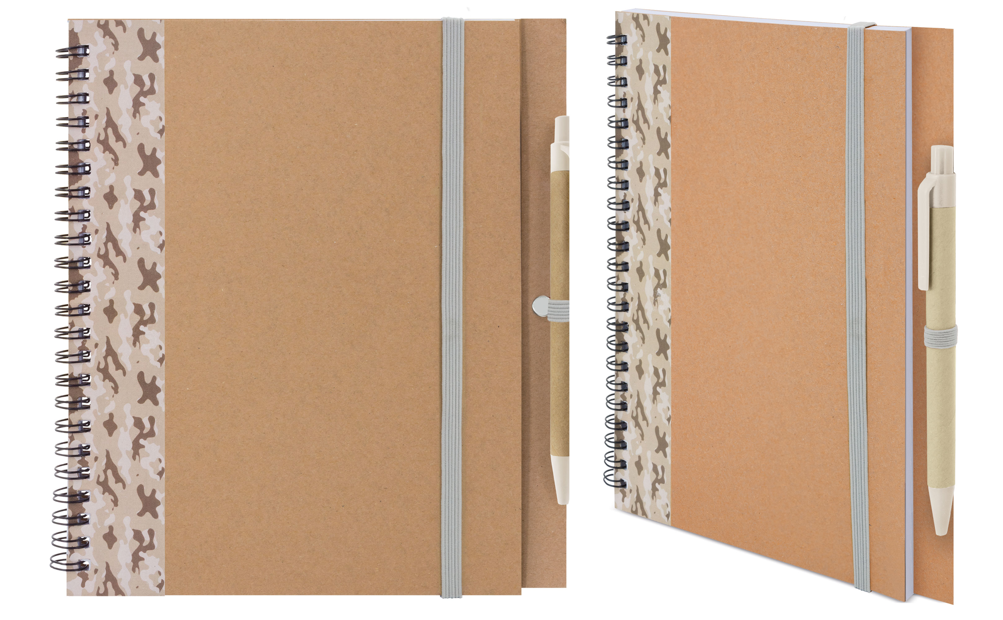 Conjunto de bloc de notas con bolígrafo a juego, realizados en cartón reciclado con acabados en distintos tipos de camuflaje. Disponibles en formato A5 (10402) y A6 (10400)