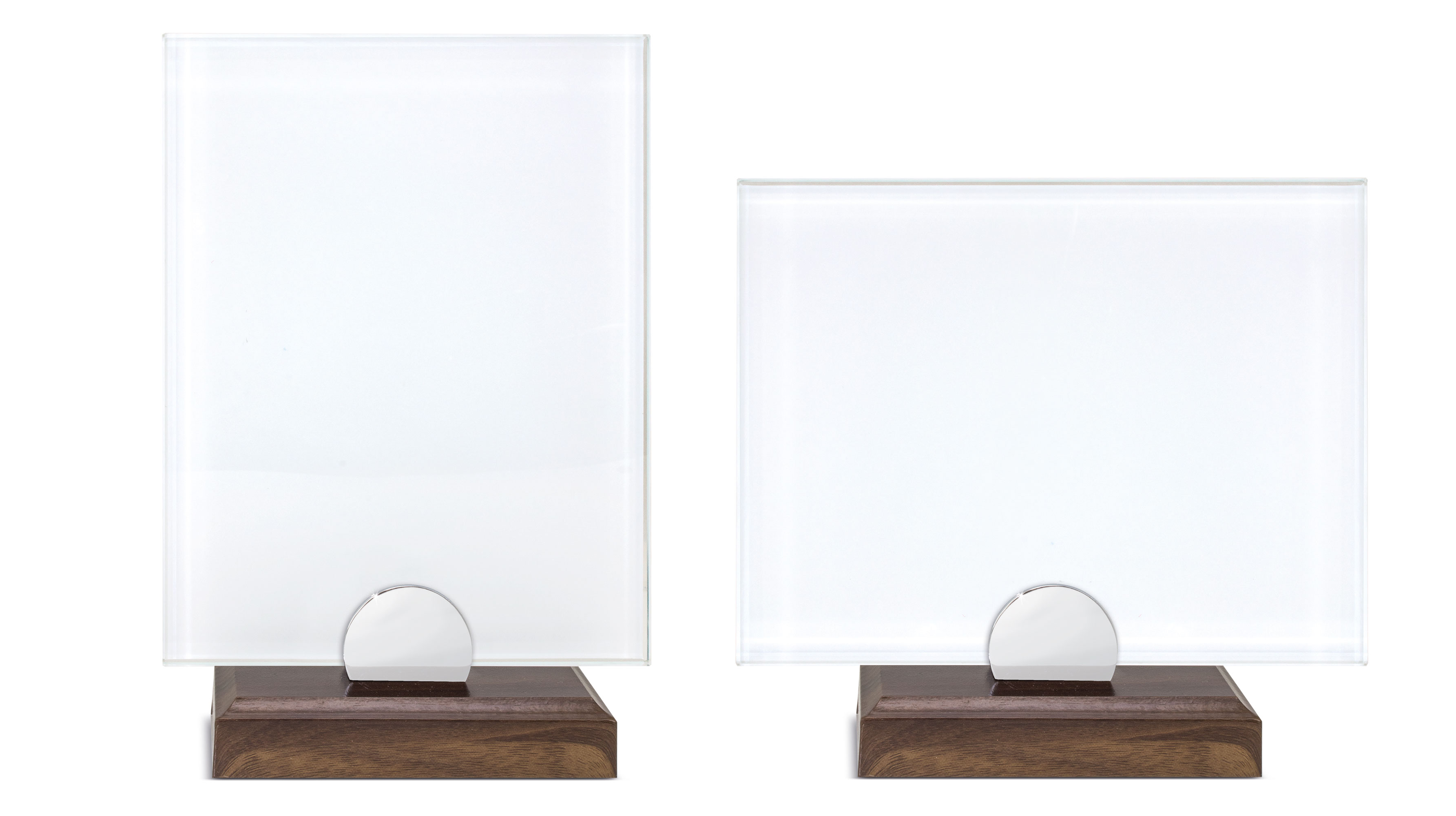 Placas de cristal de alta calidad presentadas en una peana de madera maciza, con un diseño elegante, ideal para regalar en eventos o como conmemoración.