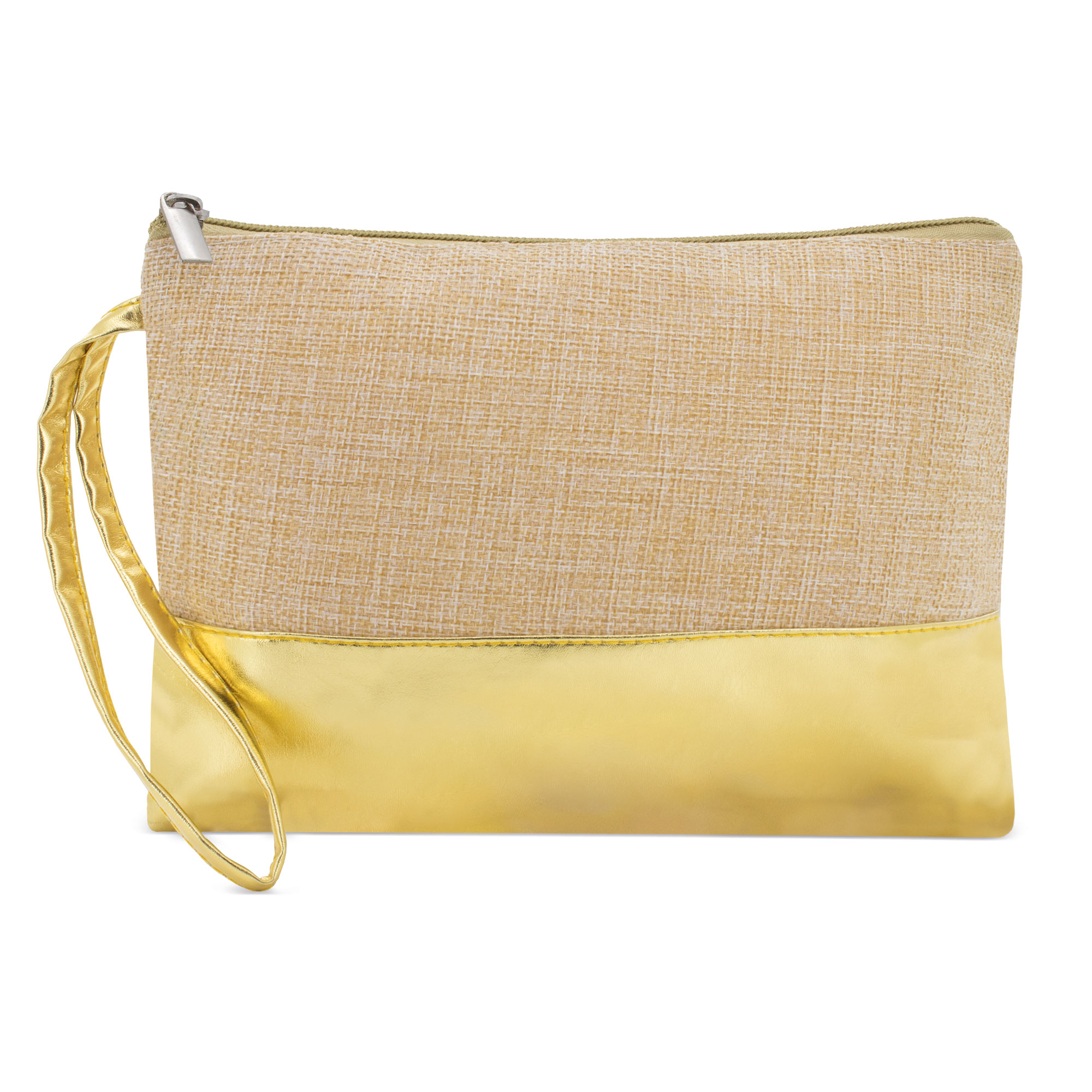 Combina el estilo natural del Jute con la elegancia de la polipiel metalizada en tono dorado en este neceser práctico y estiloso.