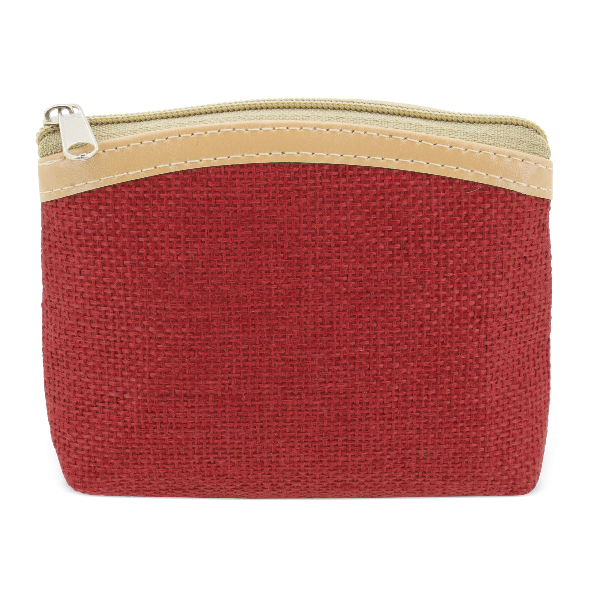 Monedero realizado en un tejido similar al yute, y un aplique de polipiel en la parte superior.