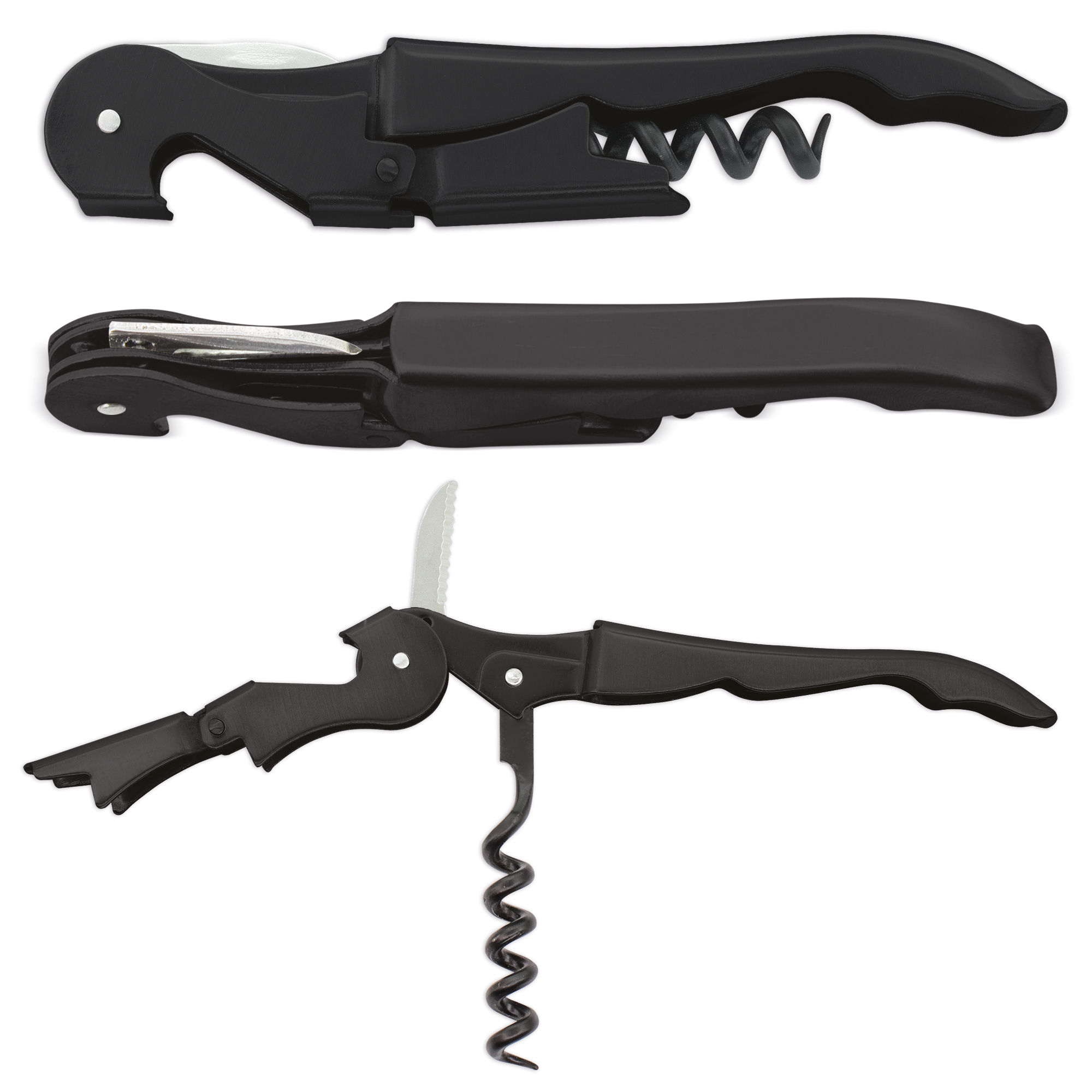 Nueva generación de sacacorchos con doble palanca, para una suave y fácil extracción del tapón. Incluye un práctico abrebotellas con mango ergonómico en color.