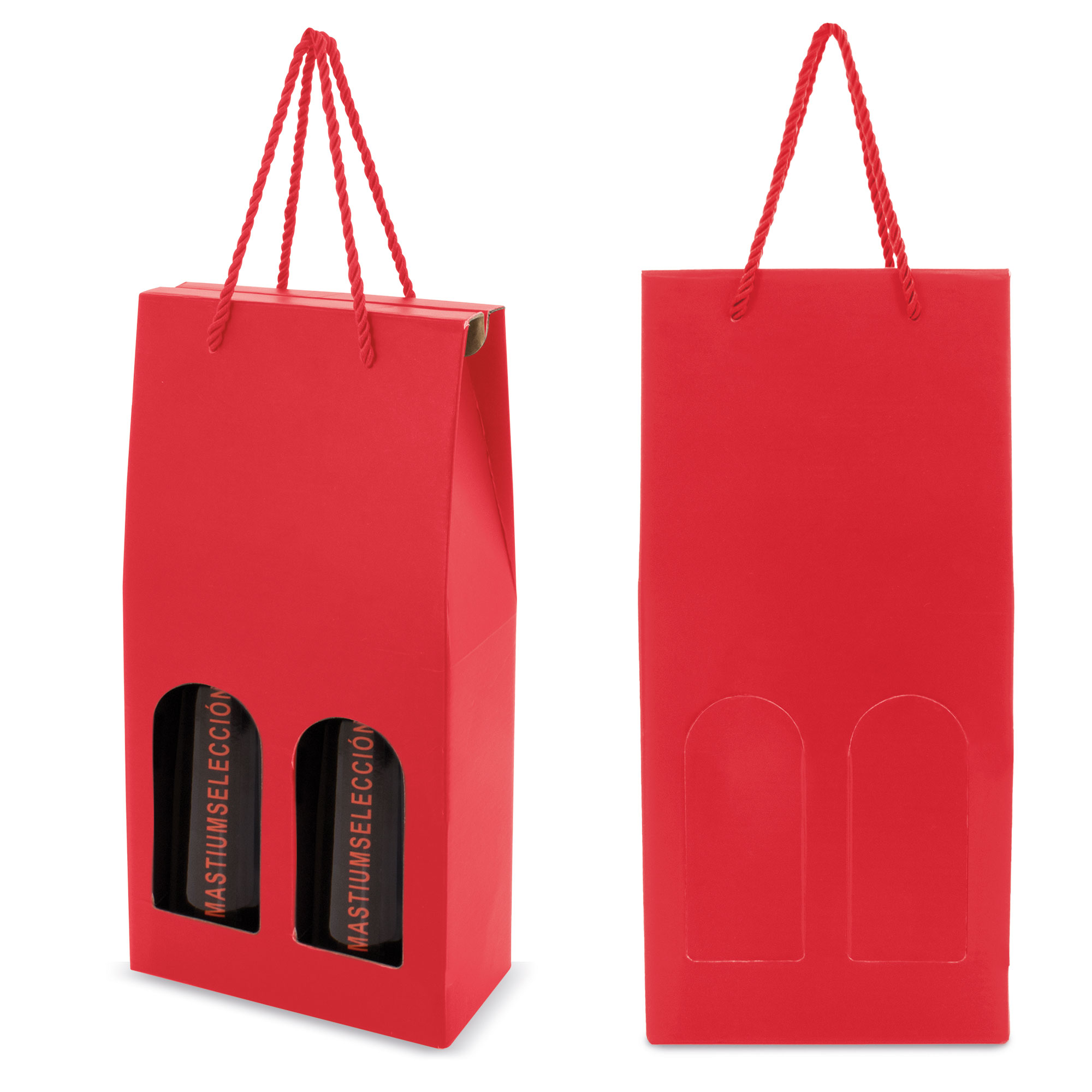 Lujoso y elegante estuche automontable con capacidad para dos botellas de vino realizado en cartón reforzado y cordón de suave textura.