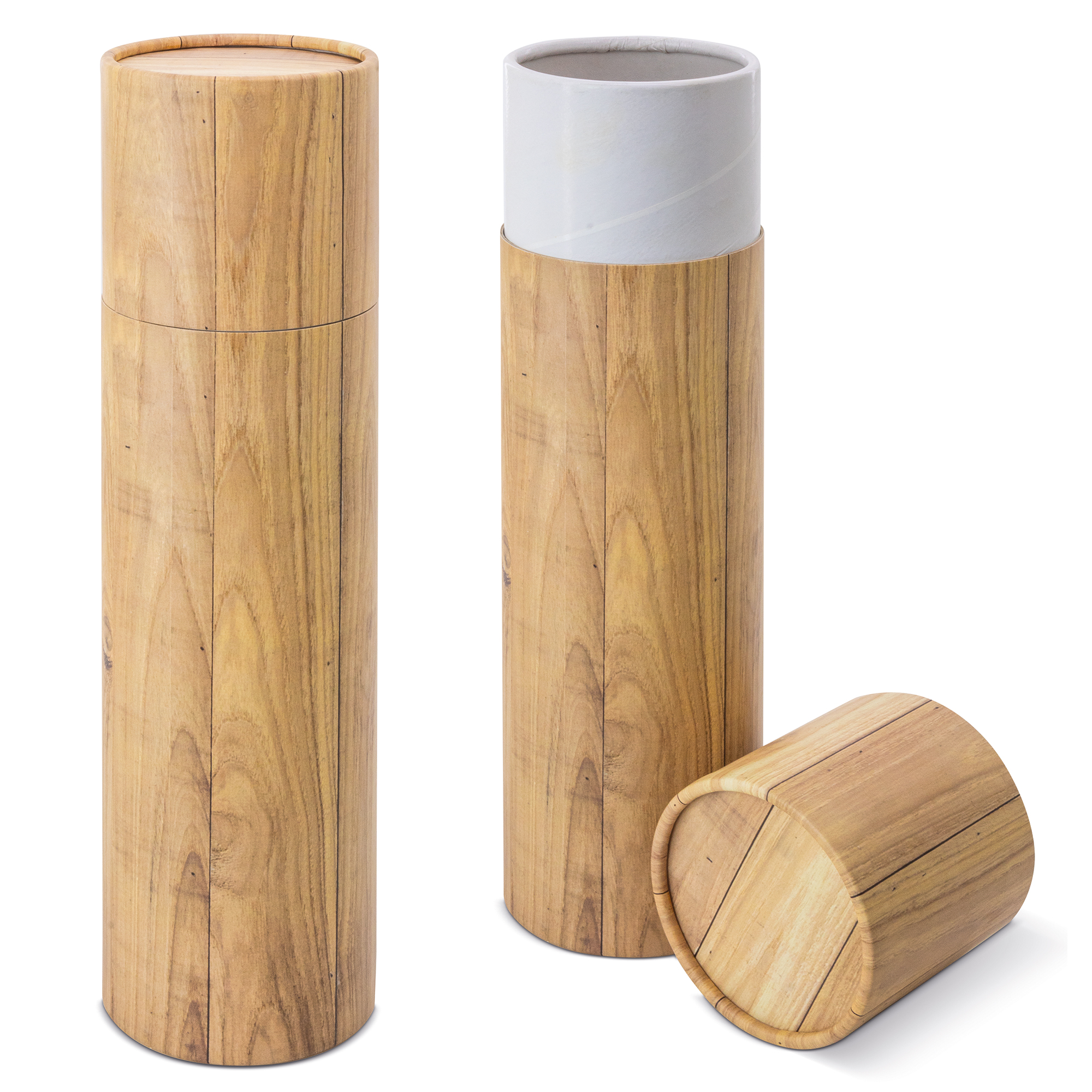 Tubo de cartón con tapa, envase original y práctico para botellas.