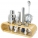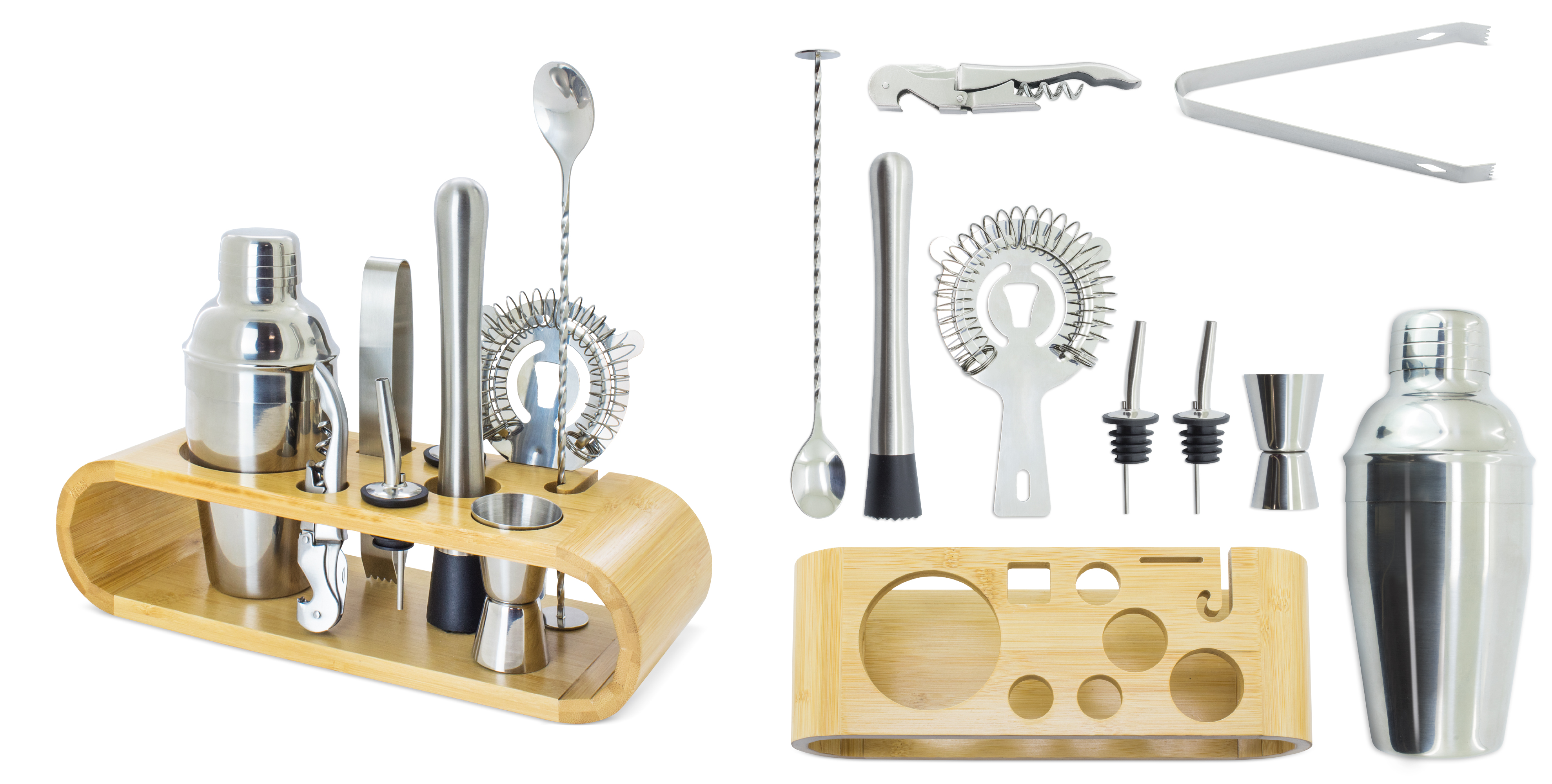 Completo set profesional, presentado en una base de bambú, contiene una coctera (350 ML) un dosificador de doble medida, un colador, un mortero, una cuchara, dos vertidores, un sacacorchos, una pinza de hielo.