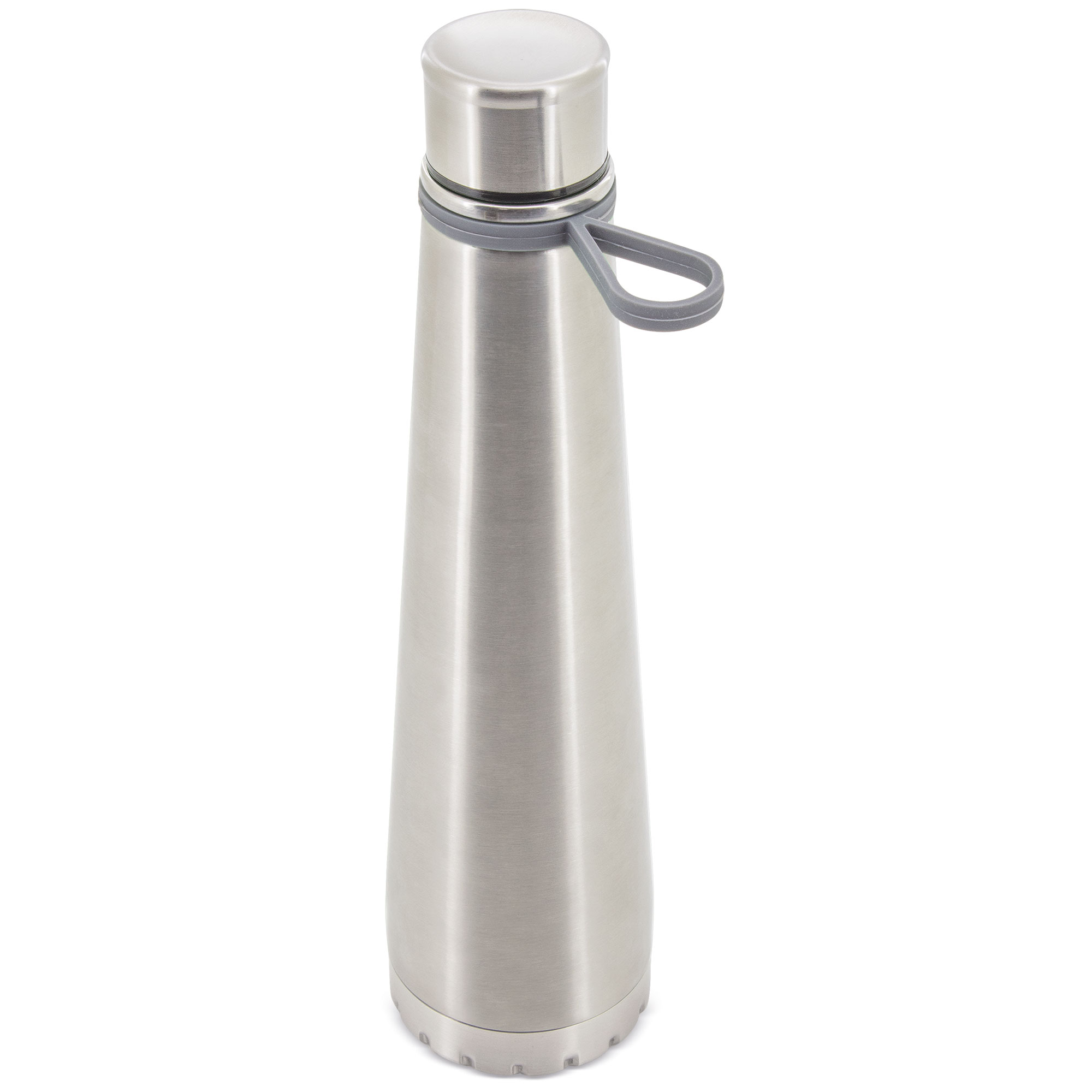 Botella de acero inoxidable “Disen”, en acabado metalizado (Plata), o con cuerpo esmaltado en color Blanco, Negro, Rojo, Verde y Azul. Con diseño innovador y sofisticado. Práctico tirador de silicona.