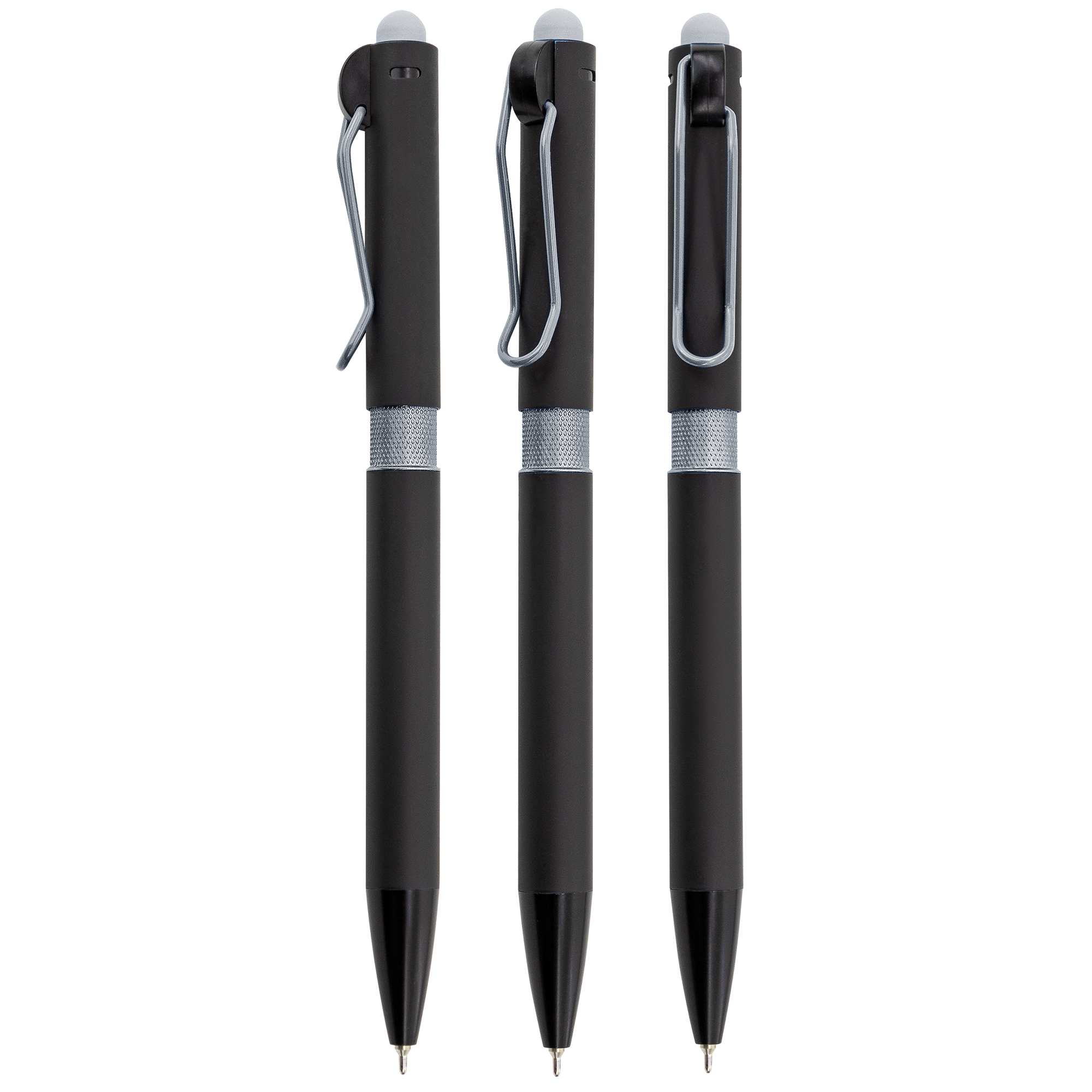 Bolígrafo realizado en textura soft effect, cuerpo de bolígrafo de goma negra, clip metálico y goma touch en color.