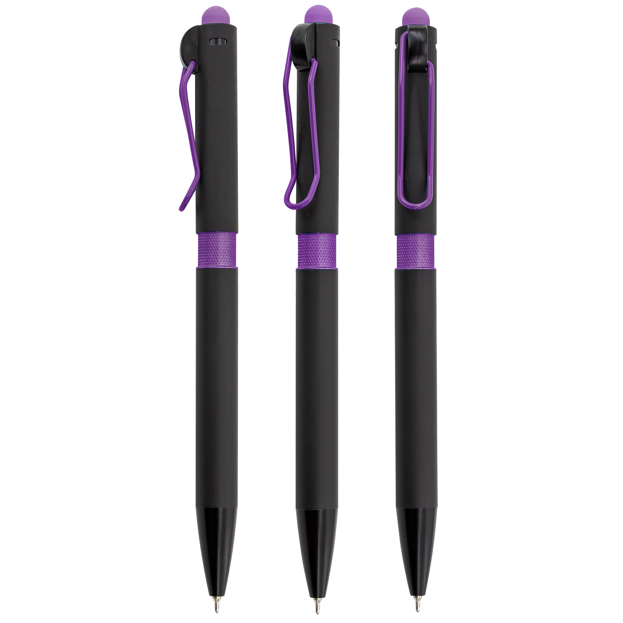 Bolígrafo realizado en textura soft effect, cuerpo de bolígrafo de goma negra, clip metálico y goma touch en color.