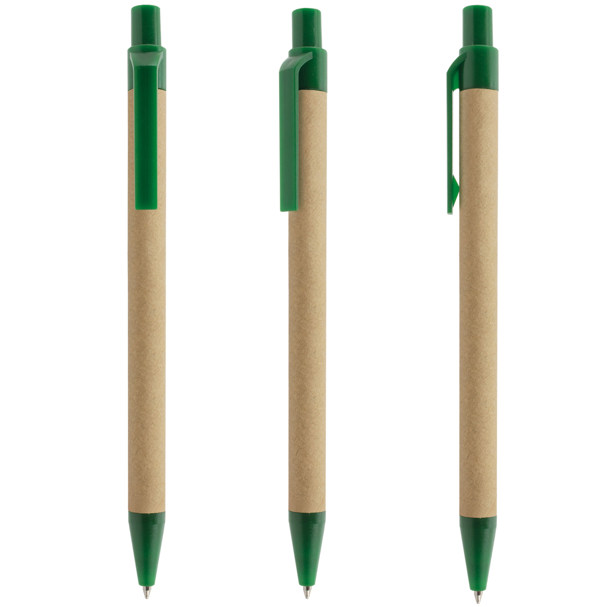 Nueva colección de bolígrafos con pulsadores de colores llamativos opacos, combinados con cuerpo de cartón reciclado de color natural.