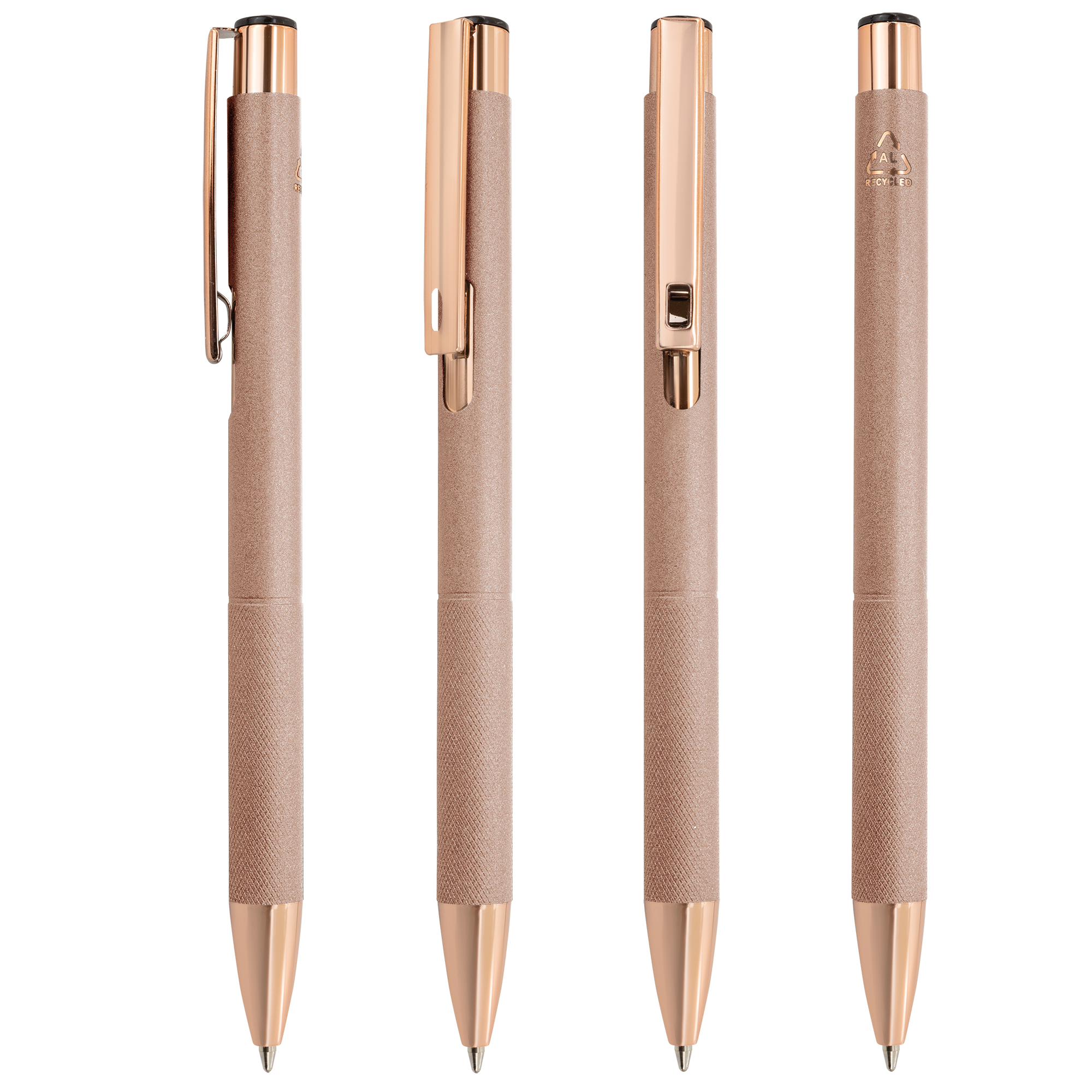 Bolígrafo fabricado en aluminio reciclado, con acabado mate y detalles en tono oro rosé. Su cuerpo elegante y minimalista es ideal como regalo corporativo. Incorpora una zona texturizada en la empuñadura que mejora el agarre.