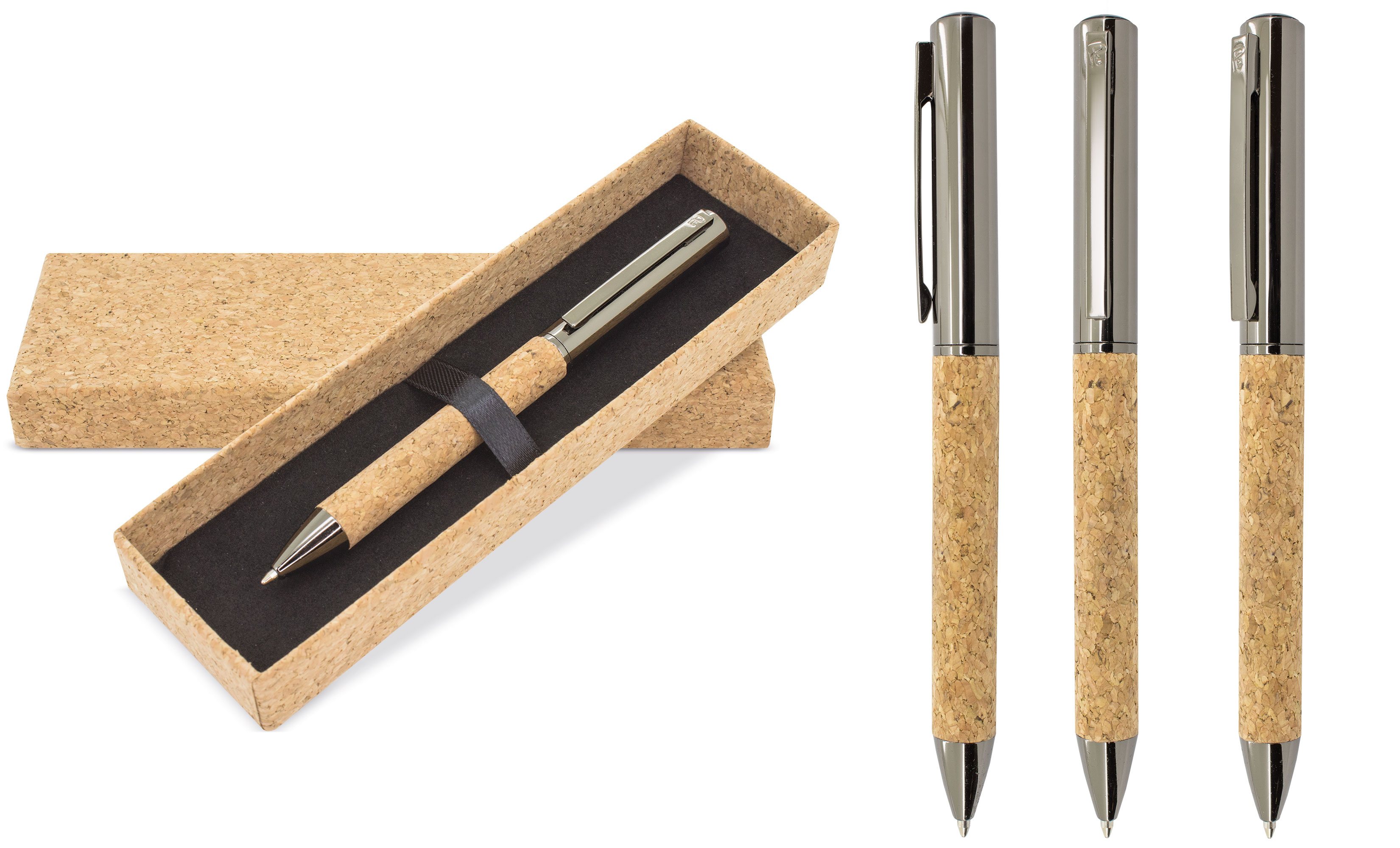 Nuevo set de estuche y bolígrafo realizado en corcho, se sirve montado. Escritura azul.