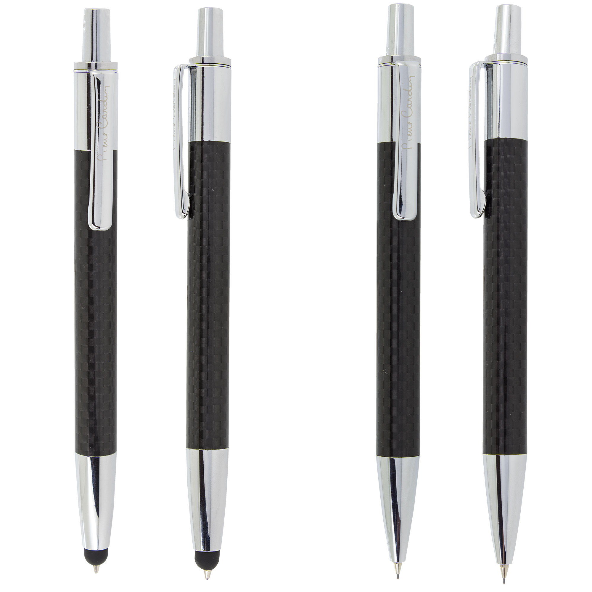 Elegante estuche de la firma Pierre Cardin, compuesto por un bolígrafo con touch y un portaminas con diseño inspirado en la textura de la fibra de carbono.