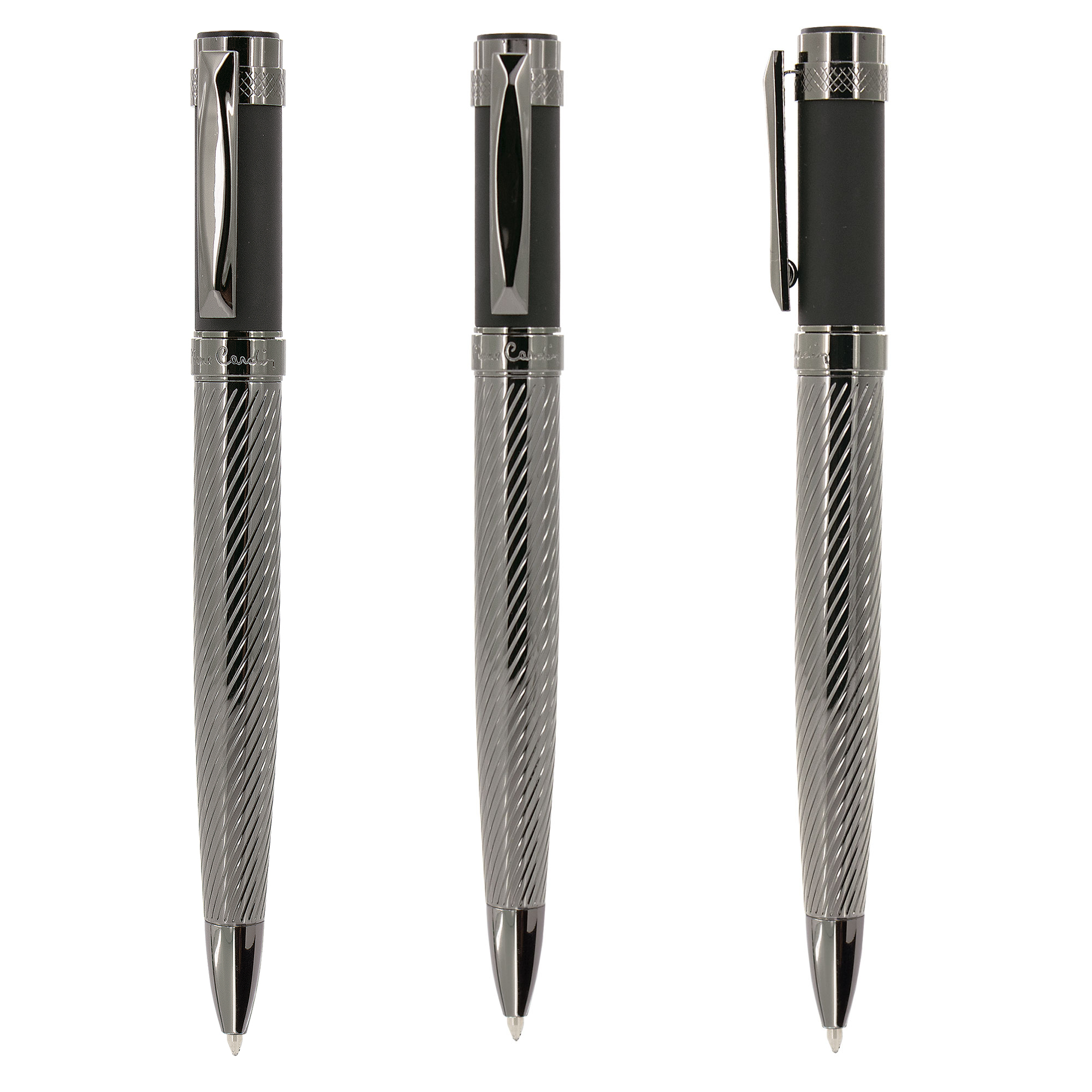 cuerpo con relieve en espiral y logotipo de la marca Pierre Cardin grabado bajo el clip, la parte superior, imitando al grafito, es de tacto suave y perfecta para grabar en laser.