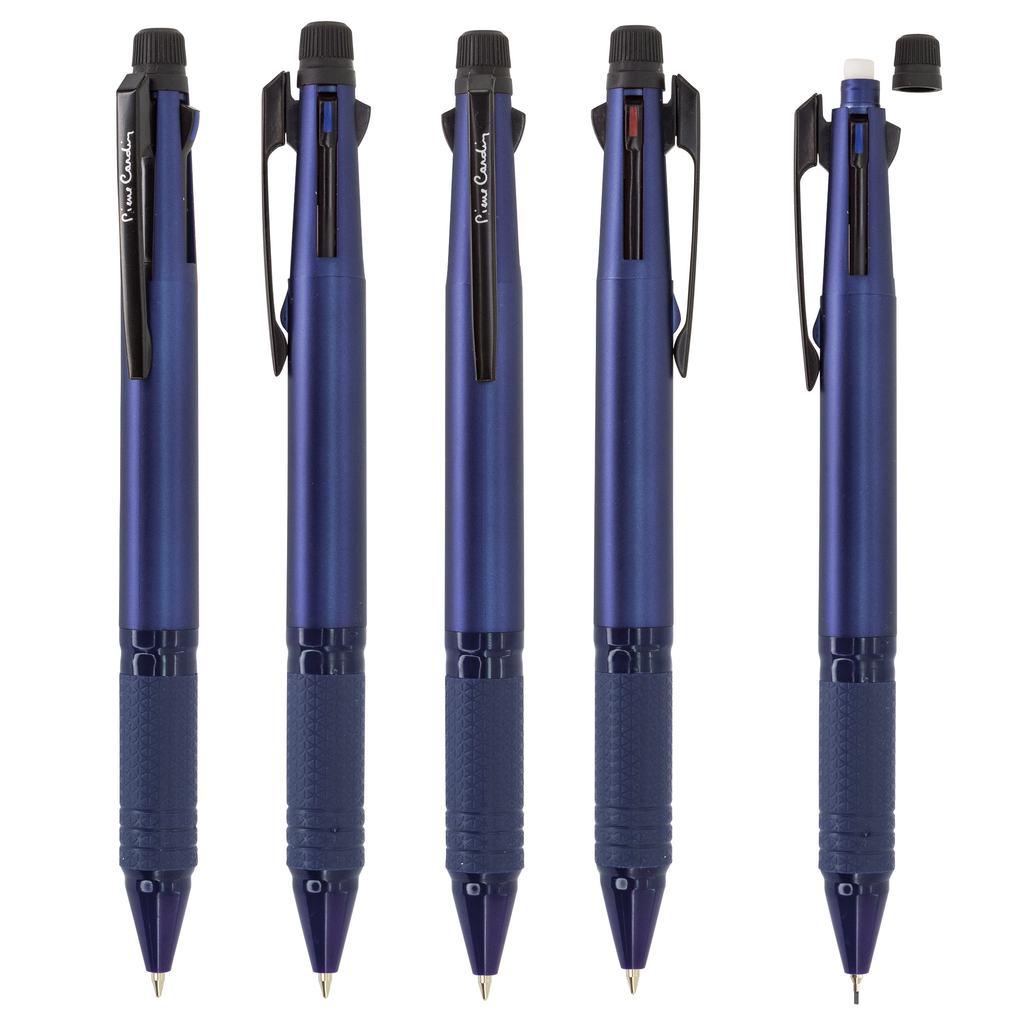6 en 1, bolígrafo escritura azul, rojo y negro, portaminas y goma. Disponible en color negro, rojo y azul.