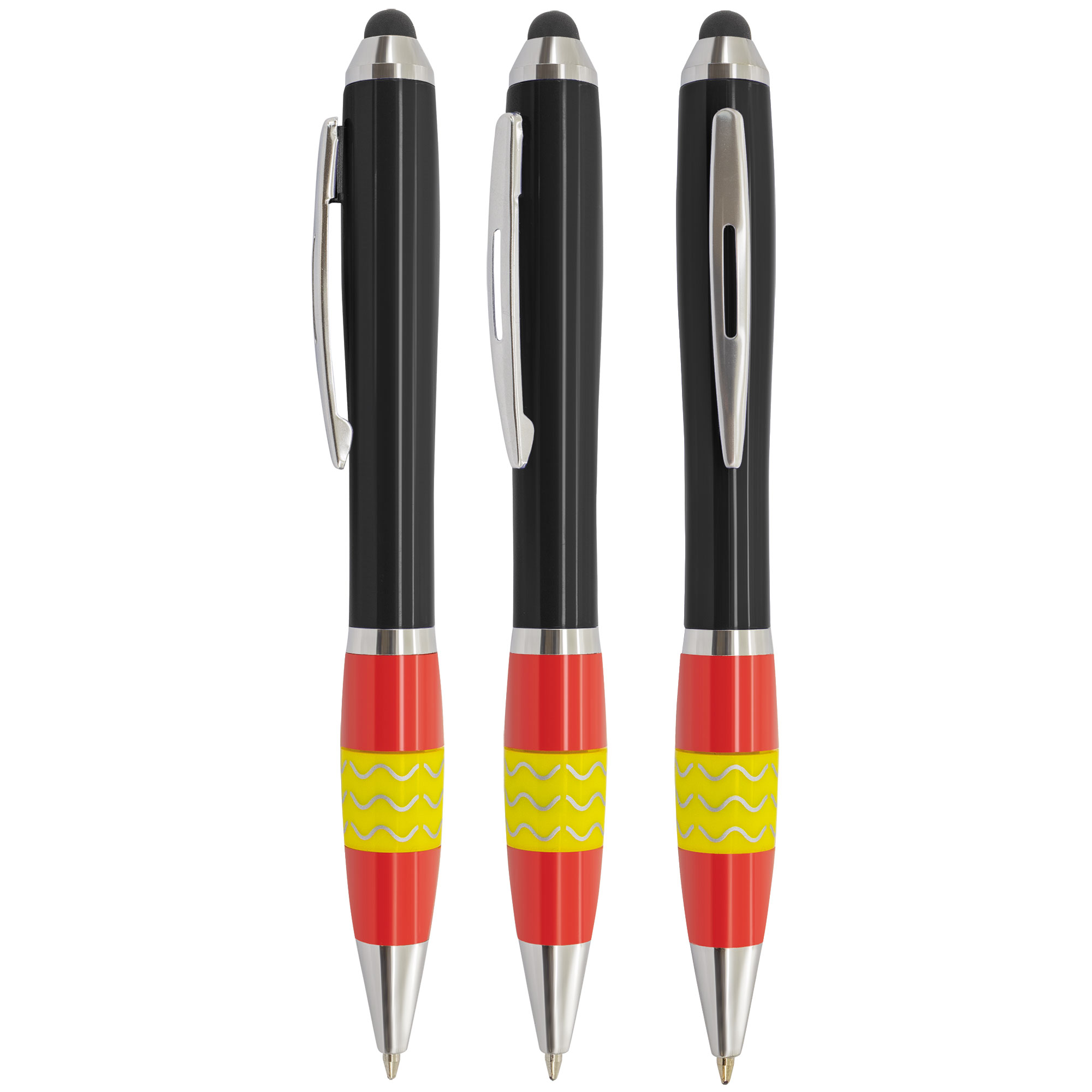 Bolígrafo antiestrés giratorio con detalle bandera españa, francia e Italia. Escritura azul