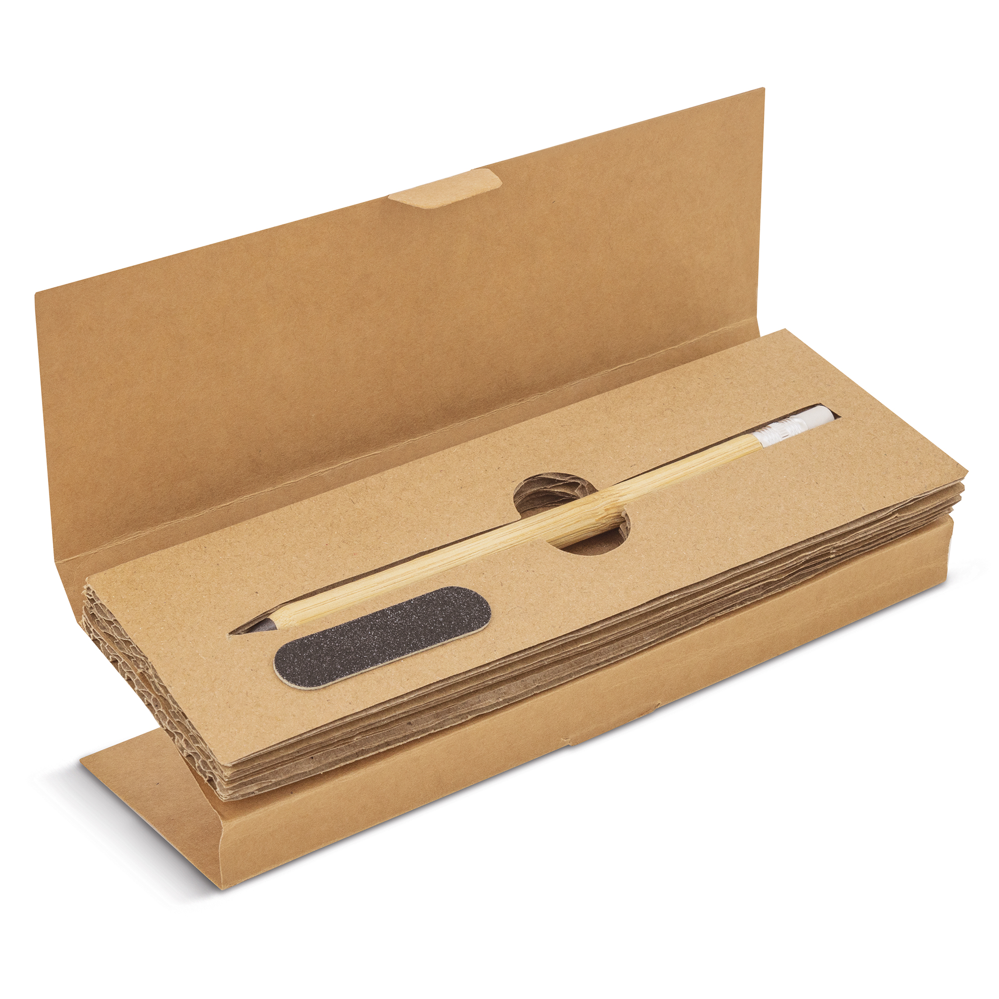 Set de cartón reciclado compuesto por un lápiz infinito, fabricado en bambú con goma que no deja residuos y lima, para afilar la punta y tenera siempre como nueva.