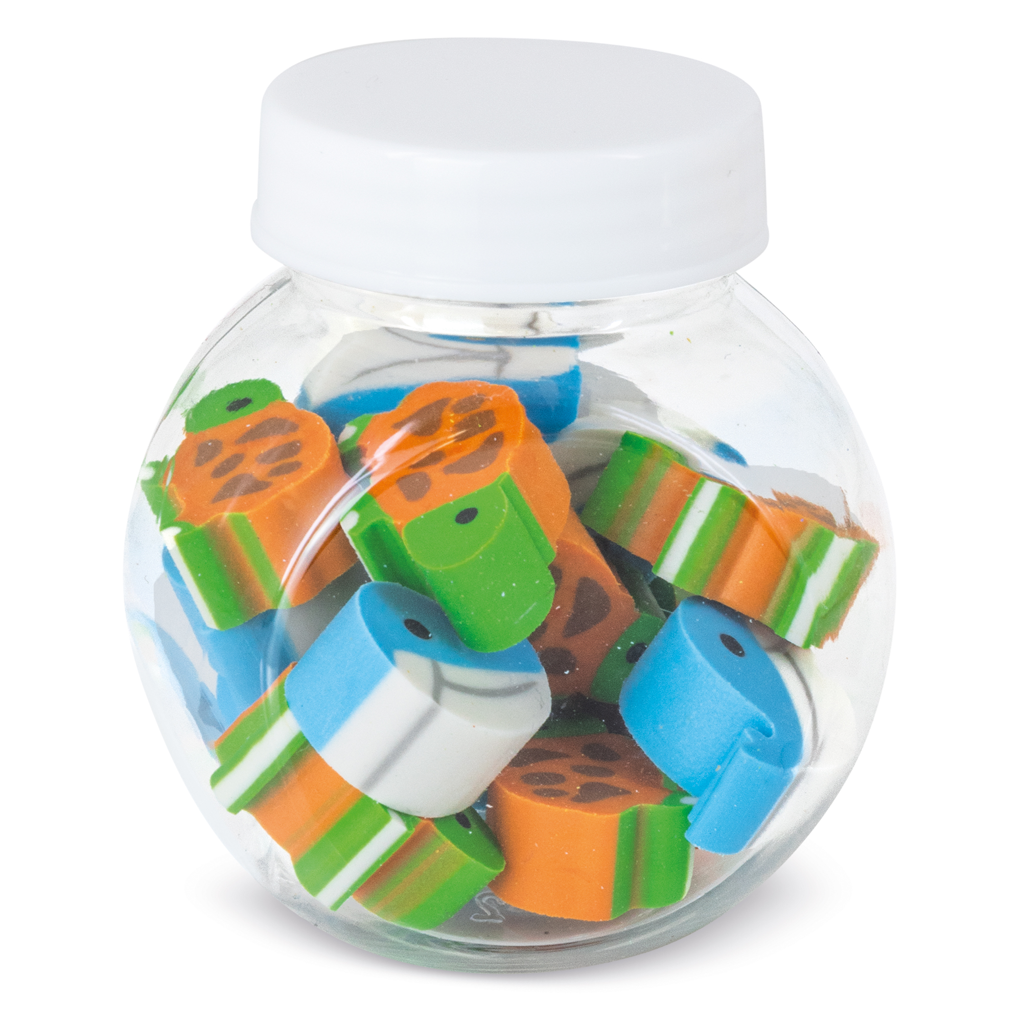Set de gomas surtidas empaquetadas en una práctica botella transparente.