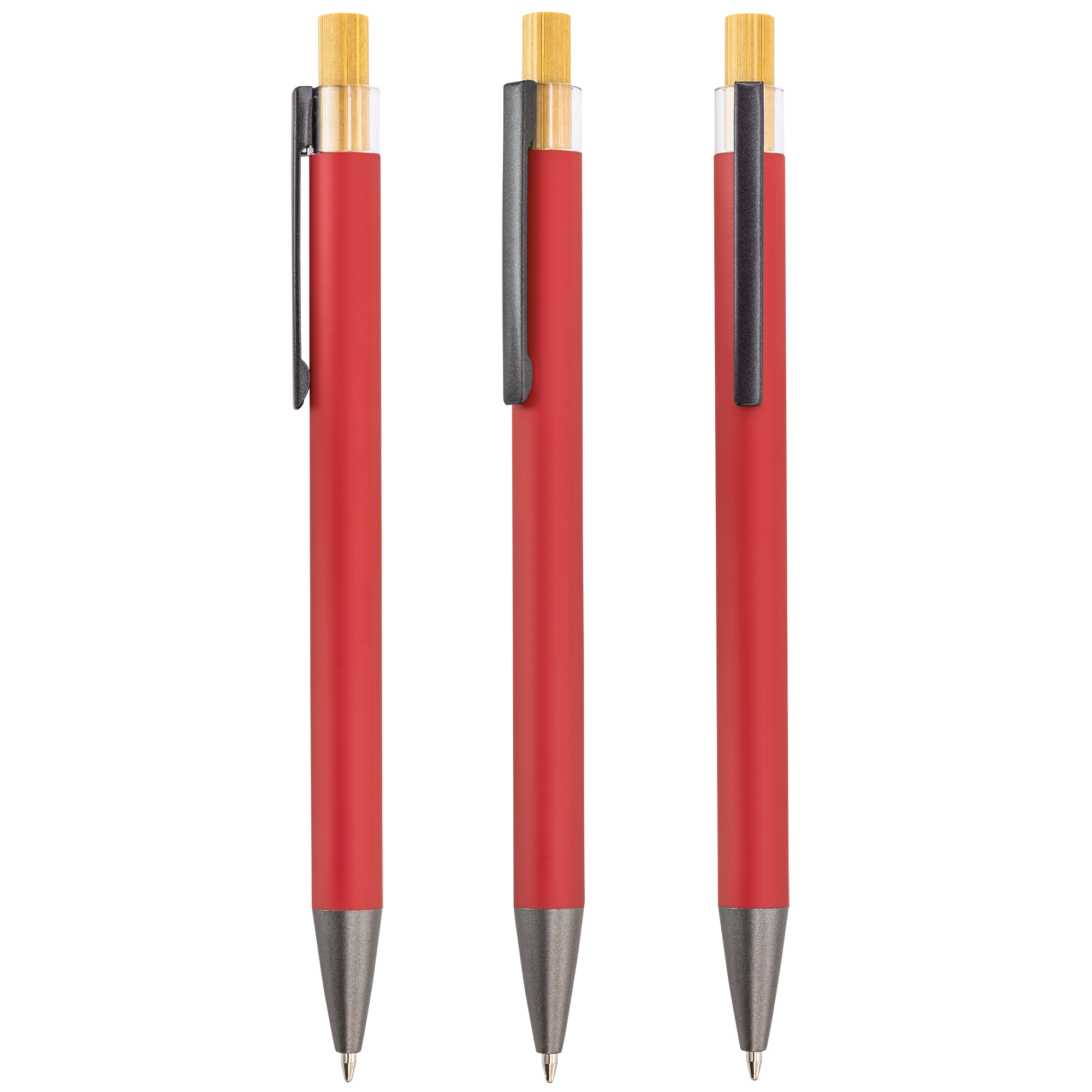 Bolígrafo con cuerpo de aluminio en acabado mate y pulsador de bambú natural. Combina estilo moderno y materiales eco, ideal para destacar con un detalle útil y sostenible.