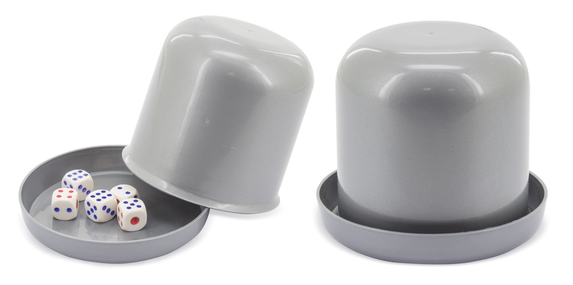 Se compone de cubilete plástico con bandeja, que a su vez hace de tapa y 5 dados.