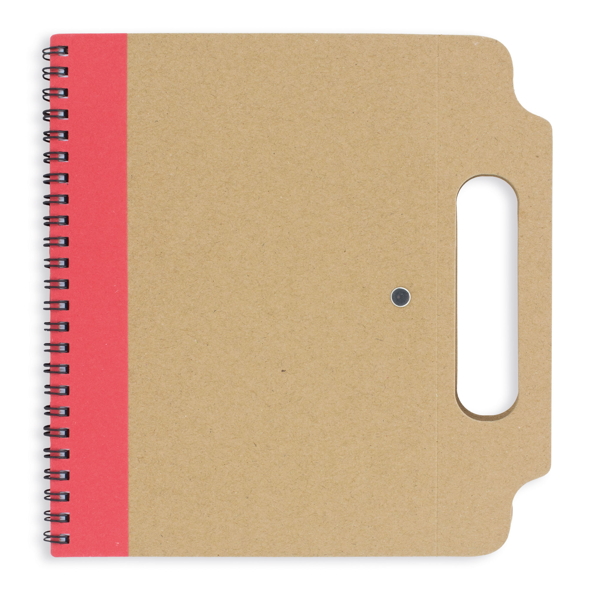Tiene un detalle de color en ellateral de la anilla. En su interior, además de la libreta con líneas, encontramos un bolígrafo de cartón reciclado a juego con el color del exterior, y un conjunto de notas adjesivas de varios colores.