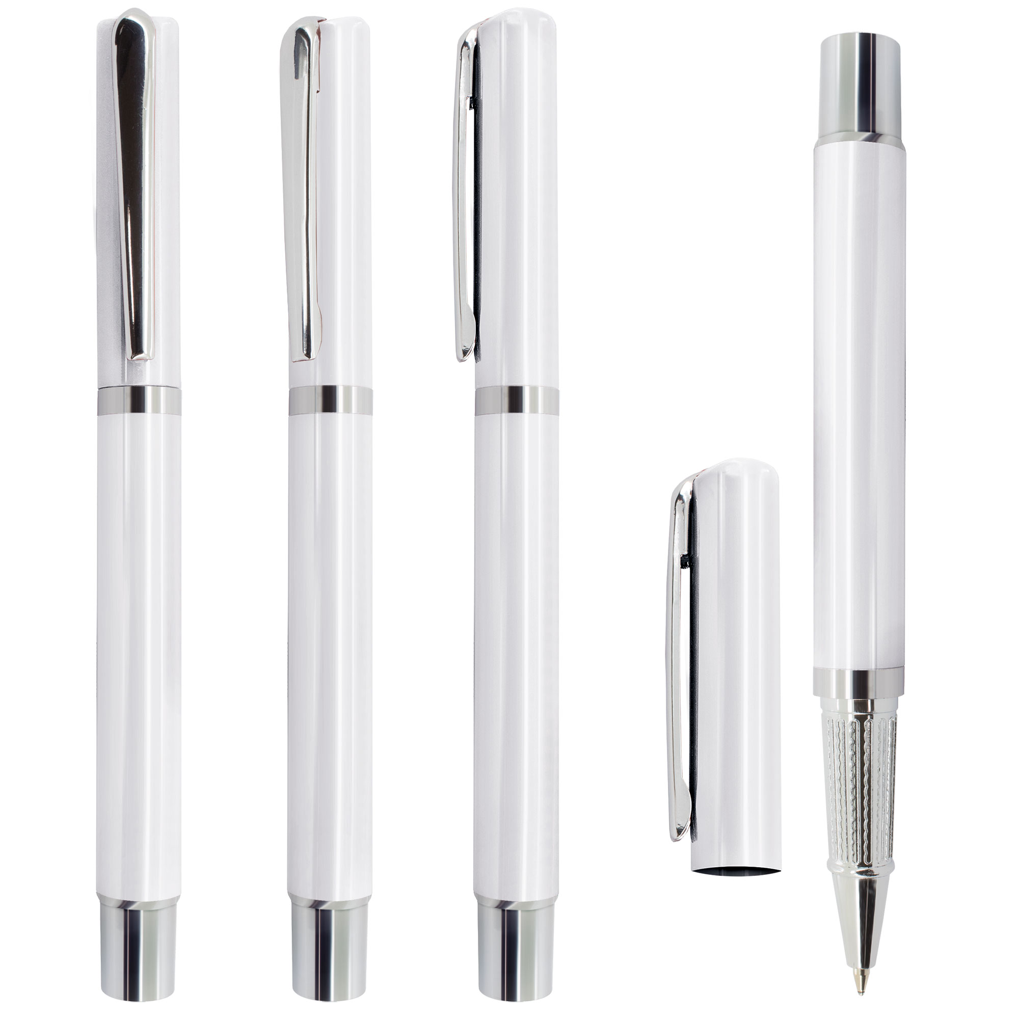 Elegante roller con terminaciones metalizadas y tinta de gel, imitando la escritura de una pluma clásica.