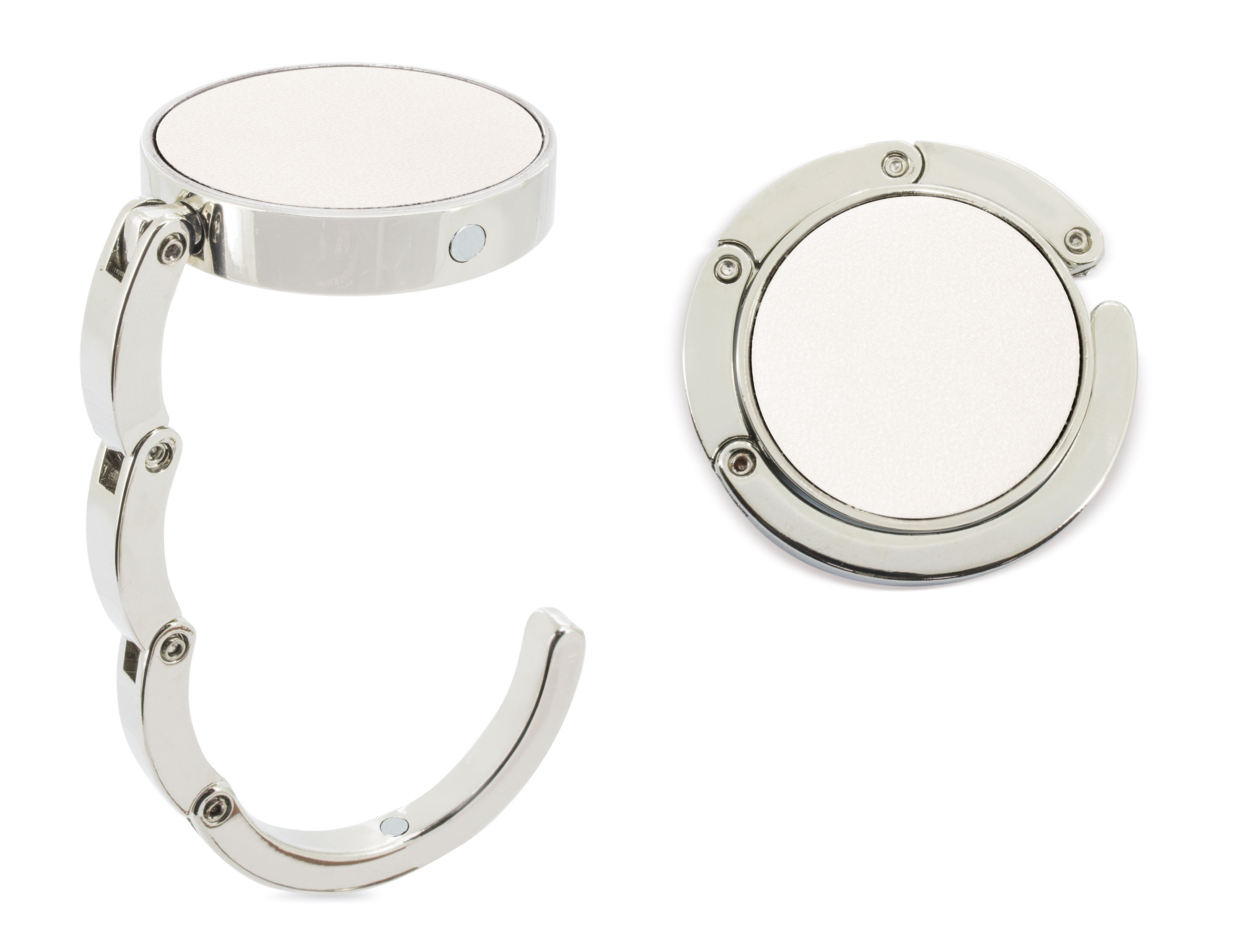 Cuelgabolsos con acabado en PVC texturizado. Disponible en gran variedad de colores que se adaptan a cualquier tipo de evento. Tiene un imán para que quede perfectamente plegado. Incluye estuche presentación.
