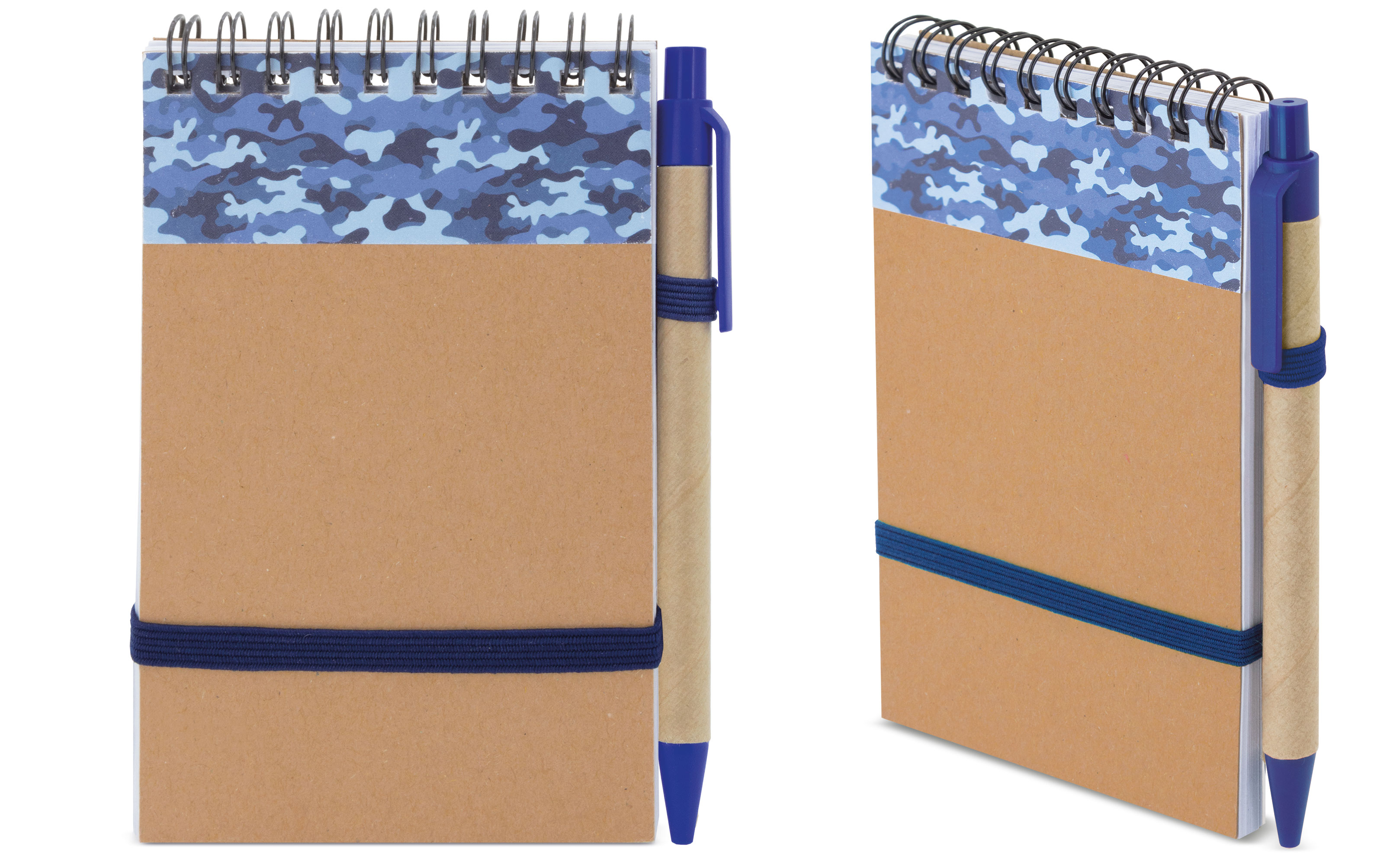 Conjunto de bloc de notas con bolígrafo a juego, realizados en cartón reciclado con acabados en distintos tipos de camuflaje. Disponibles en formato A5 (10402) y A6 (10400)