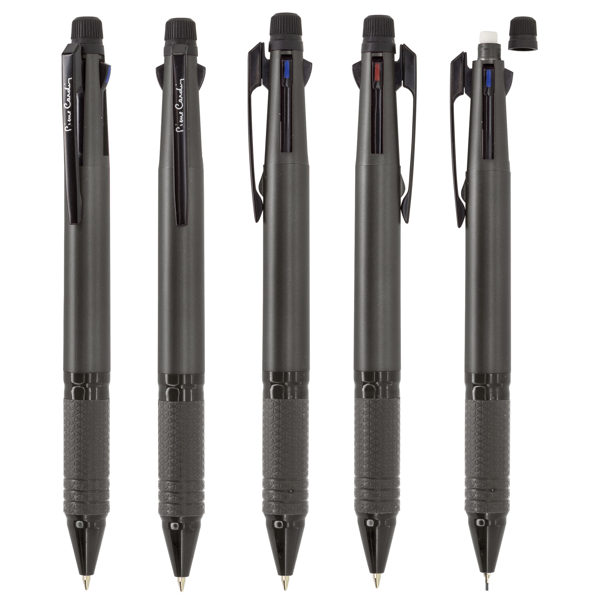 7 en 1, bolígrafo escritura azul, rojo y negro, portaminas y goma. Disponible en color negro, rojo y azul.
