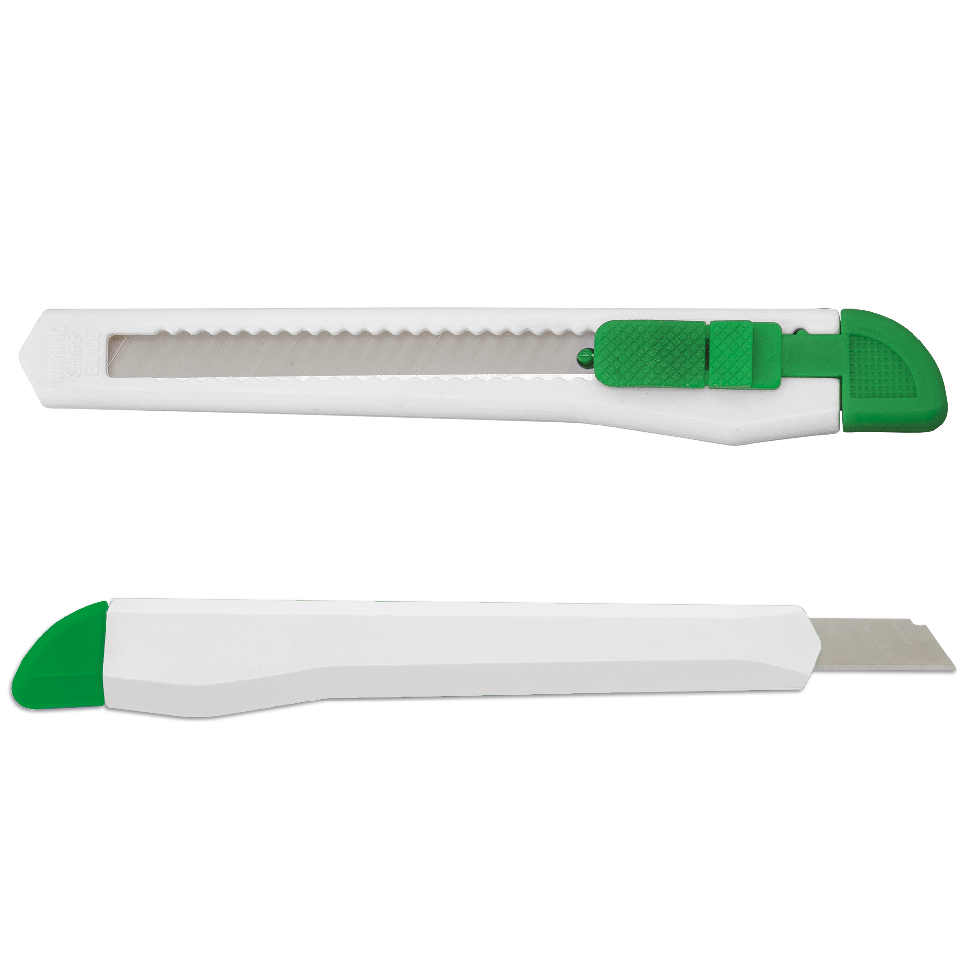 Cutter con mango realizado en abs y cuchilla de acero, cada pieza presentada en bolsa individual